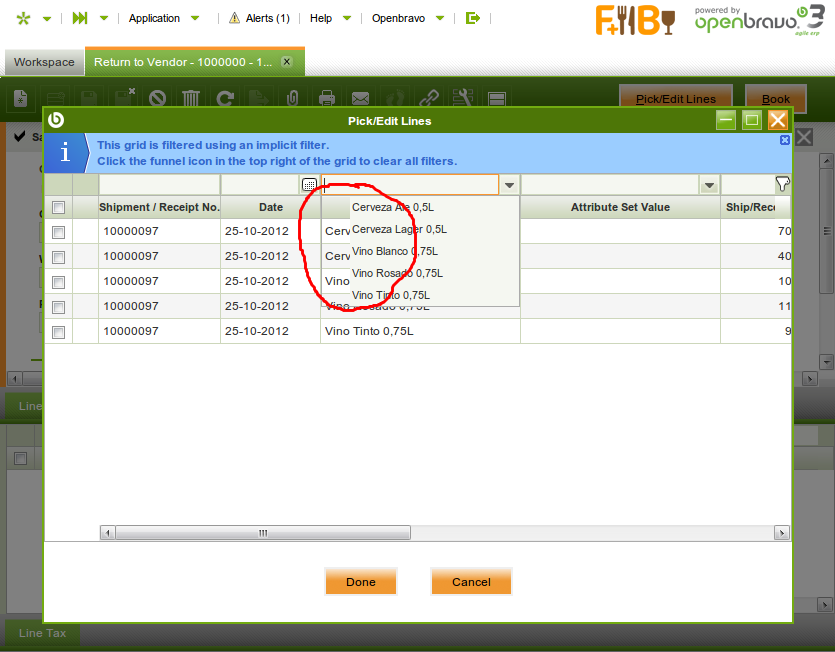 | Steps To Reproduce | -Go to Return to Vendor window -Create a new record: BP: Bebidas Alegres, S.L. -Click on Pick/Edit lines -Try to filter by Product -> Not working | |||||||