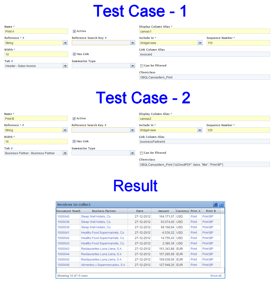 Risk: low/medium 0) Test that previous print buttons are still working ok As "Openbravo Admin" * Go to "Sales Order" * Select any record * Click "Print" toolbar button. Ensure that you can do "just printing" and "print + attack" As "Openbravo Admin" * Go to "Business Partner" * Select any record * Click "Print" toolbar button. Ensure that the popup is shown 1) Add simple "Print" button As "System Administrator" * Go to "Widget" window * Select record with "Widget Title": "Invoices to collect" * Go to "Query" subtab * Go to "Column" subtab * Create new record with the values of the attached png (Test Case - 1) * Save 2) Add complex "Print" button As "System Administrator" * Go to "Widget" window * Select record with "Widget Title": "Invoices to collect" * Go to "Query" subtab * Go to "Column" subtab * Create new record with the values of the attached png (Test Case - 2) * Save 3) Test the result As "Openbravo Admin" * Add "Invoices to collect" widget * Ensure that "Print A" and "Print B" columns are added, and that the Print buttons work ok. Note that for "Print A" case the button should just print the record, without any kind of notification/popup |