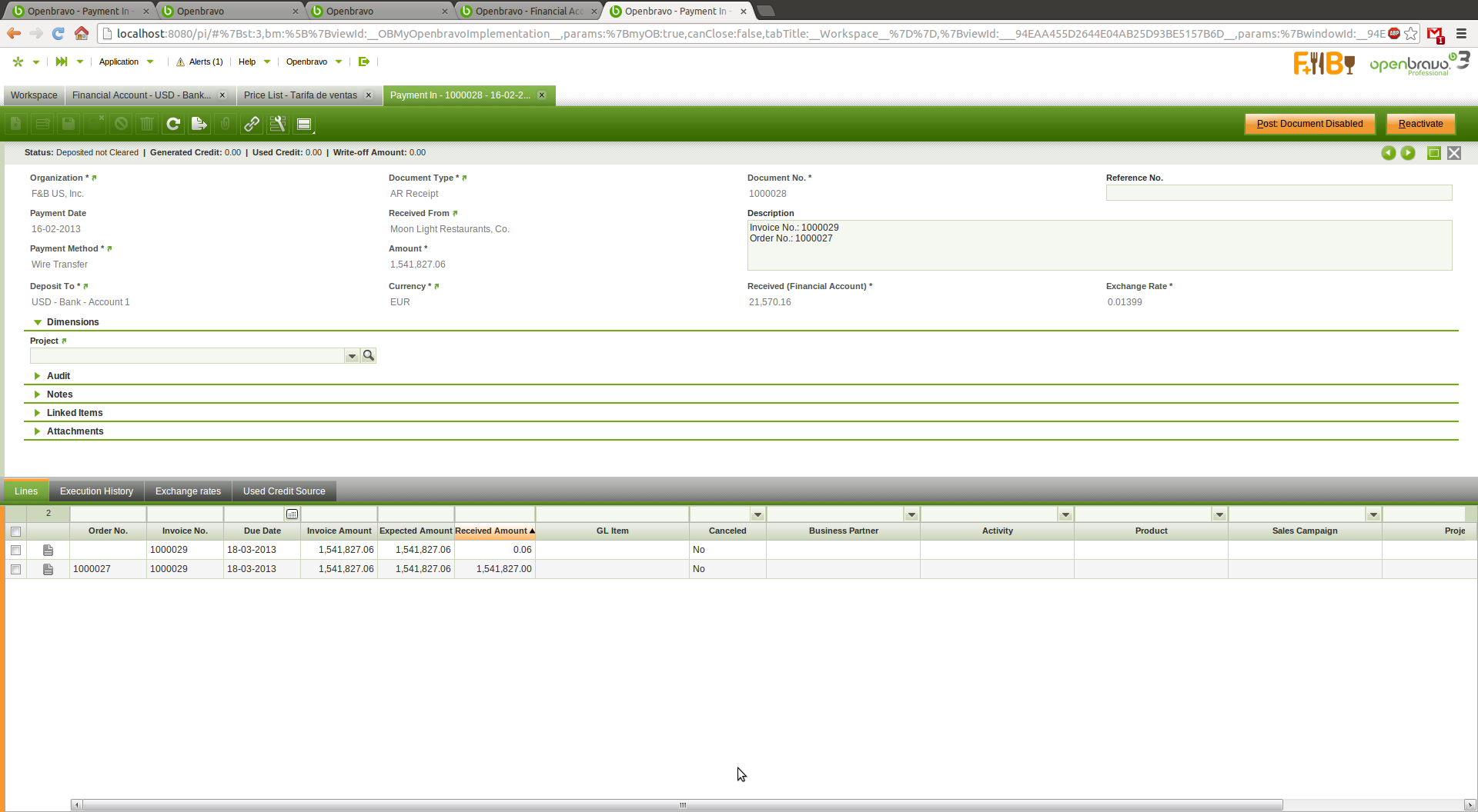 | Steps To Reproduce | . in F&B . go to currency window - USD . conversion rate -> to EUR (from 01-07-2013 to 30-09-2013) change "Divide Rate By" to 0.01399 . go to currency window - EUR . conversion rate -> to USD (from 01-07-2013 to 30-09-2013) change "Multiple Rate By" to 0.01399 . go to financial account: usd- bank account 1 . go to payment method: transferencia . select: receive payments in multiple currencies . go to pricelist "tarifa de ventas" . change org: * . go to product "cerveza ale 0.5" . change org: * . create new sales order . org: F&B US, Inc. . order date: 06-07-2013 . bp: moon light . price list: tarifa de venta . invoice terms inmediate . new line: . product: cerveza ale 0.5 . qty: 1 . net unit price , net list price: 1,541,827.00 . tax: exento . create new sales invoice . org: F&B US, Inc. . order date: 06-07-2013 . bp: moon light . price list: tarifa de venta . create lines from: . select previous sales order . change the amount in line to 1541827.06 .process . add payment . payment date 06/07/2013 . process & deposit payment generated should be similar to attachment1.jpg . go to financial account - > transaction . post error is returned. if manual post works, you should post with background process  | |||||||