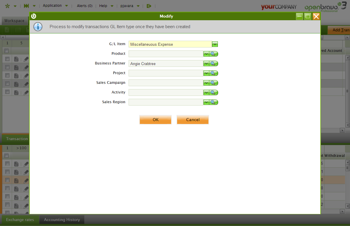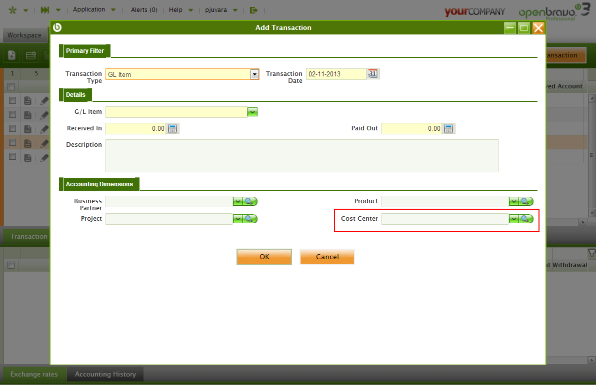 1) Configure the system to support cost centers for Financial Account transactions. . 1.1) Navigate to Client window, check Central Maintenance and make sure that Cost Center is selected at header level . 1.2) Logout and login 2) In the Financial Account window, click on Add Transaction and select GL Item; you will see a cost center field 3) In the Financial Account window, select a previously created GL Item transaction and press Modify. Notice that you can modify cost center, user1 and user2 dimensions |