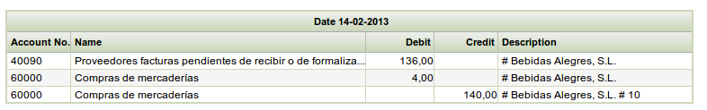 code review + testing OK Testing Plan 1) Create new Purchase Order Header - Organization: F&B España - Región Norte - Business Partner: Refrescos Naturales S.A. * Line - Line No: 10 - Product: Agua sin Gas 1L - Ordered Quantity: 100 - Net Unit Price: 1.02 - Tax: Compras exentas 2) Go to Pending Goods receipts and receive the full order 3) Enable goods receipt accounting (General Ledger Configuration || Active Tables) 4) Go to created Goods Receipt document and post 5) Create a purchase invoice from purchase order of step 3 6) Update the unit price to 1.03. The total of the invoice will be 103 7) Complete and post the invoice 8) Enable matched invoices accounting (General Ledger Configuration || Active Tables) 9) Configure invoice price variance account for "Agua sin Gas 1L" product. 10) Got o Matched Invoices window and post the record generated for previous invoice. 11) Go to "Accounting Transactions Details" window and apply filters to check if the 1€ of difference has been posted. |