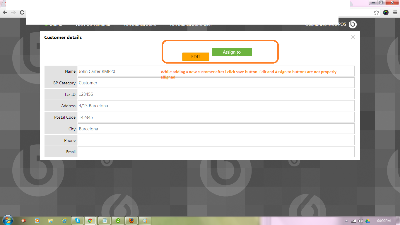 | Steps To Reproduce | Go to Openbravo ERP http://{server}/{context}/ [^] Login as Openbravo/openbravo and change the role to "The White Valley Group Admin" Go to the window "Organization" and find the record "Valblanca Store". Fillin the following fields: Default invoice term for BPs: Immediate. Default payment term for BPs: Treinta días. Default payment method for BPs: Cash Default BP Category for BPs: Customer Default country for BPs: Spain Default organization for BPs: Vall Blanca Store Go to the login URL: http://{server}/{context}/web/org.openbravo.retail.posterminal/?terminal=VBS-1 [^] Enter login credentials: "Username": vallblanca "Password": openbravo Select in the menu the option "Customer" and in the dialog that appears select "New" and enter new data: Name: John Carter Tax ID: 12345 Address: Barcelona Postal Code: 12345 City: Barcelona Tap on "Save". A message saying "Success. Customer John Carter has been saved successfully" will appear. Defect: Once i click the save button, Edit and Assign to buttons are not properly rendered Note: Refer the screen shot for more details | |||||||