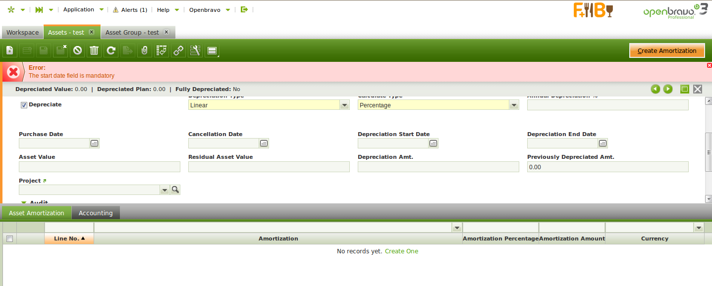| Steps To Reproduce | Navigate to Asset window. Create a new asset by entering just the mandatory fields. Save. Select the field "Depreciate" and realize that it seems there is no additional mandatory information to fill in. Press the process button "Create Amortization", you'll get below error. | |||||||||||