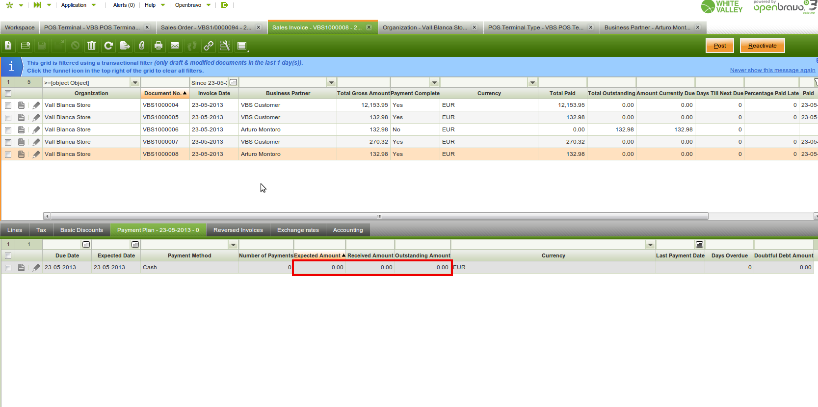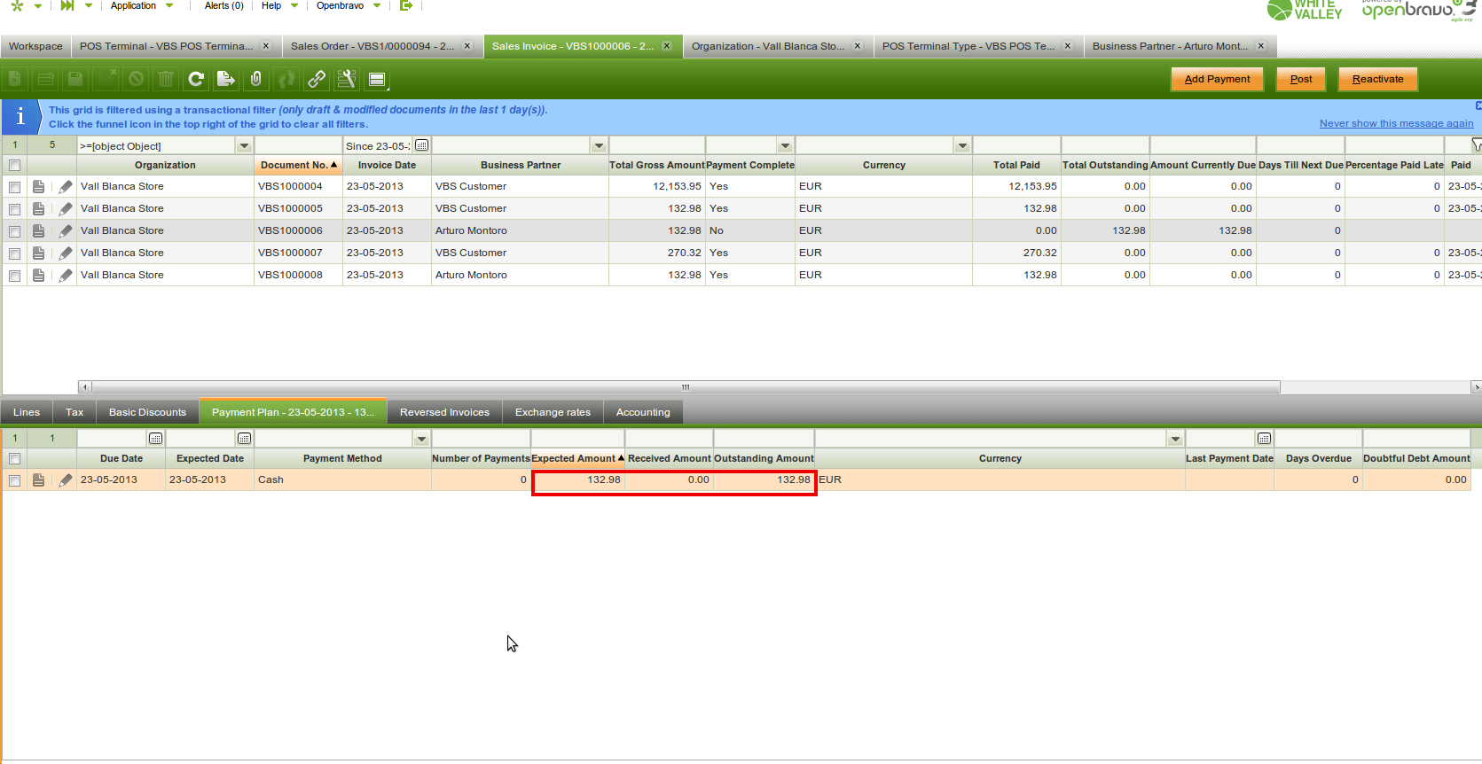 | Steps To Reproduce | -Do a cash up -Create an order -Mark the order as "invoice this order" and pay with credit. Verify the that the invoice payment plan is properly created [fine.png] -Create a new order -Pay with credit -Create a new one and pay with different BP -Do a cash up Verify that now the invoice is wrong [wrong.png]. Expected amount=0 and outstanding amount=0. Also the invoice is marked as payment complete = Yes | |||||||