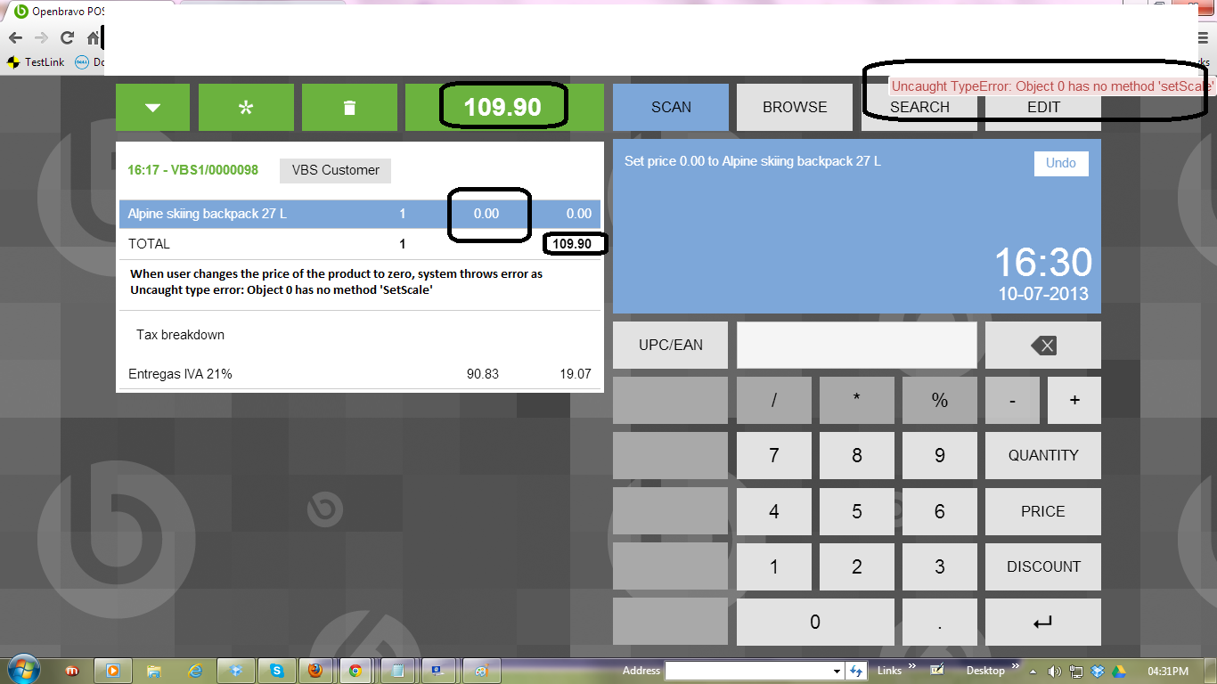| Steps To Reproduce | From webpos, select any product Then change the price to zero, right now system throws error as "Uncaught type error Object 0 has no method SetScale" | |||||||