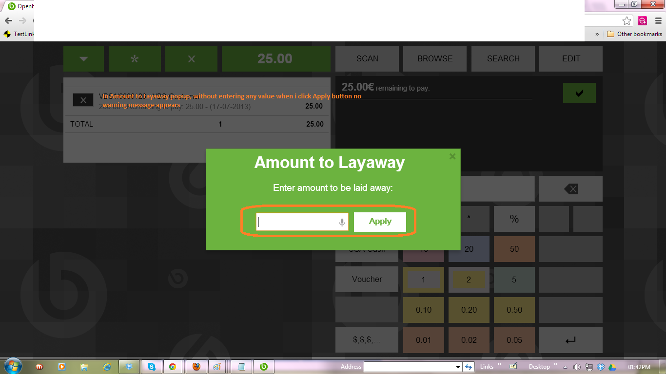| 2013-07-17 10:32 | sureshbabu | File Added: In Amount to Layaway popup, without entering any value when i click Apply button no warning message appears.png | |