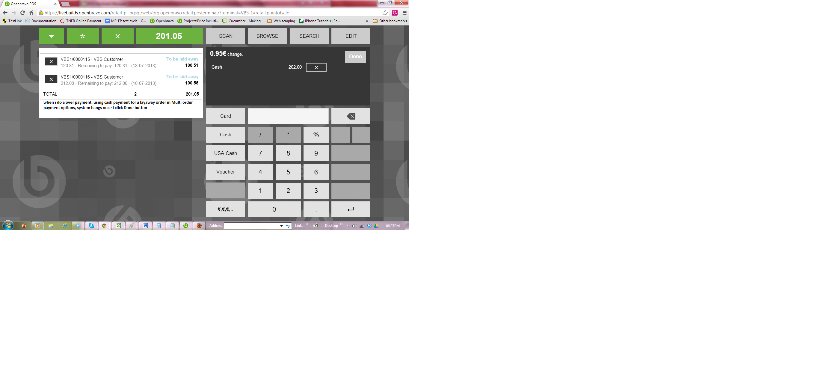 | Description | when i do a over payment, using cash payment for a layaway order, system hangs once i click Done button. | |||||||