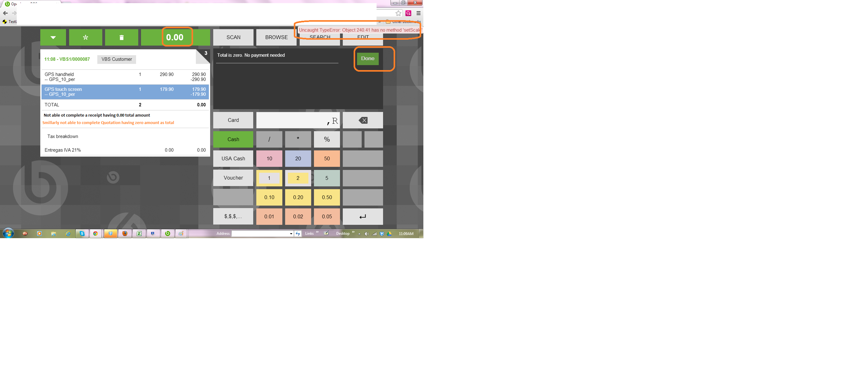 | Steps To Reproduce | 1) Create a receipt using products having 100% discount, so that the total gross amount is zero. 2) Then try to complete the receipt by clicking the "Done" button Defect: One can find, "Uncaught TypeError...." appears in the screen Note: Also not able to complete Quotation having total gross amount as zero. | |||||||