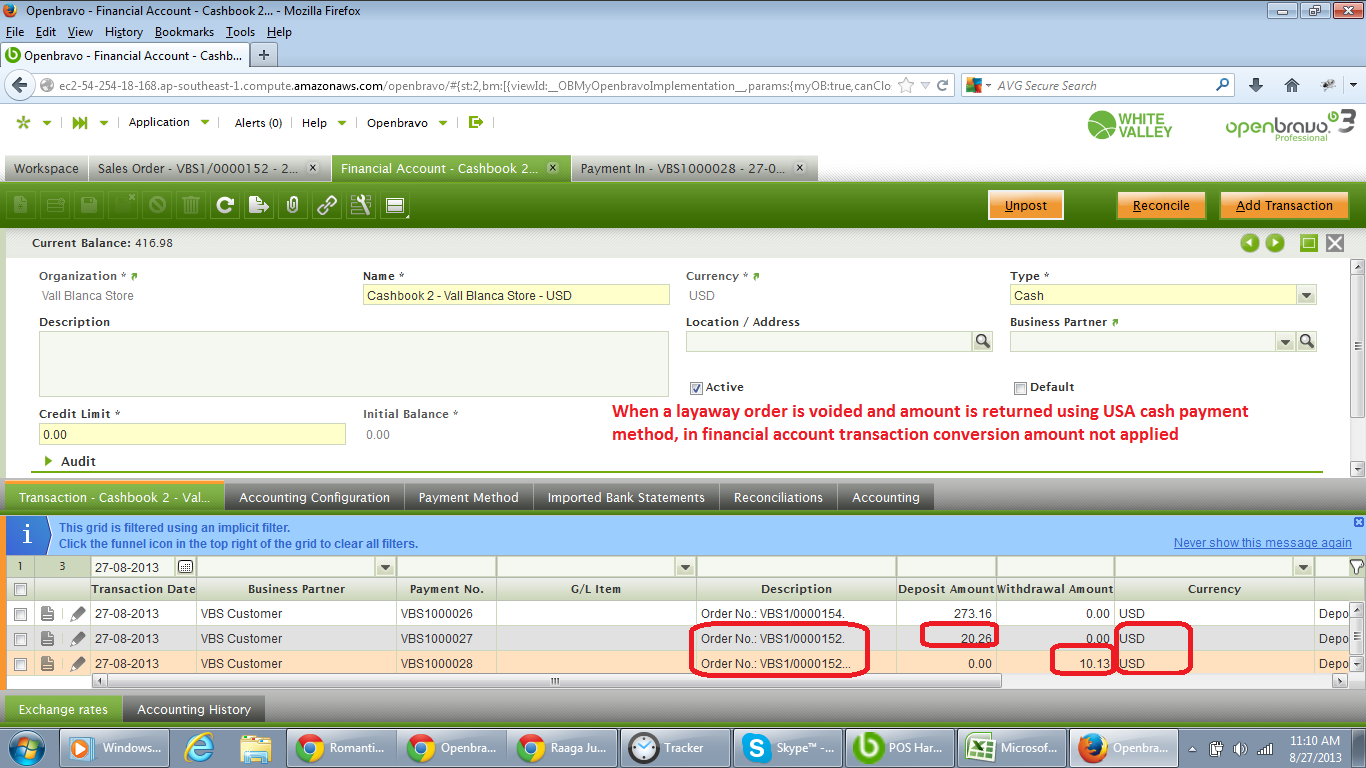 | Steps To Reproduce | Note: Conversion rate from EUR to USA multiply rate:0.5 USA to EUR Multiply rate: 2.00 1) Create a Layaway order and pay partial amount (20.26 dollars) using USA Cash payment method 2) Then reopen the above created Layaway order and select "void this Layaway" option 3) Then complete the void process by paying the amount using USA Cash Payment method. 4) Then navigate to Financial Account window and select "Cashbook 2 - Vall Blanca Store - USD" 5) Then move to transactions tab and select the transaction document which is created automatically once the layaway order is voided 6) verify the Deposit amount details Defect: Expected Deposit amount is 20.26 but right now in the system the actual deposit amount is 10.13(conversion rate not applied) | |||||||