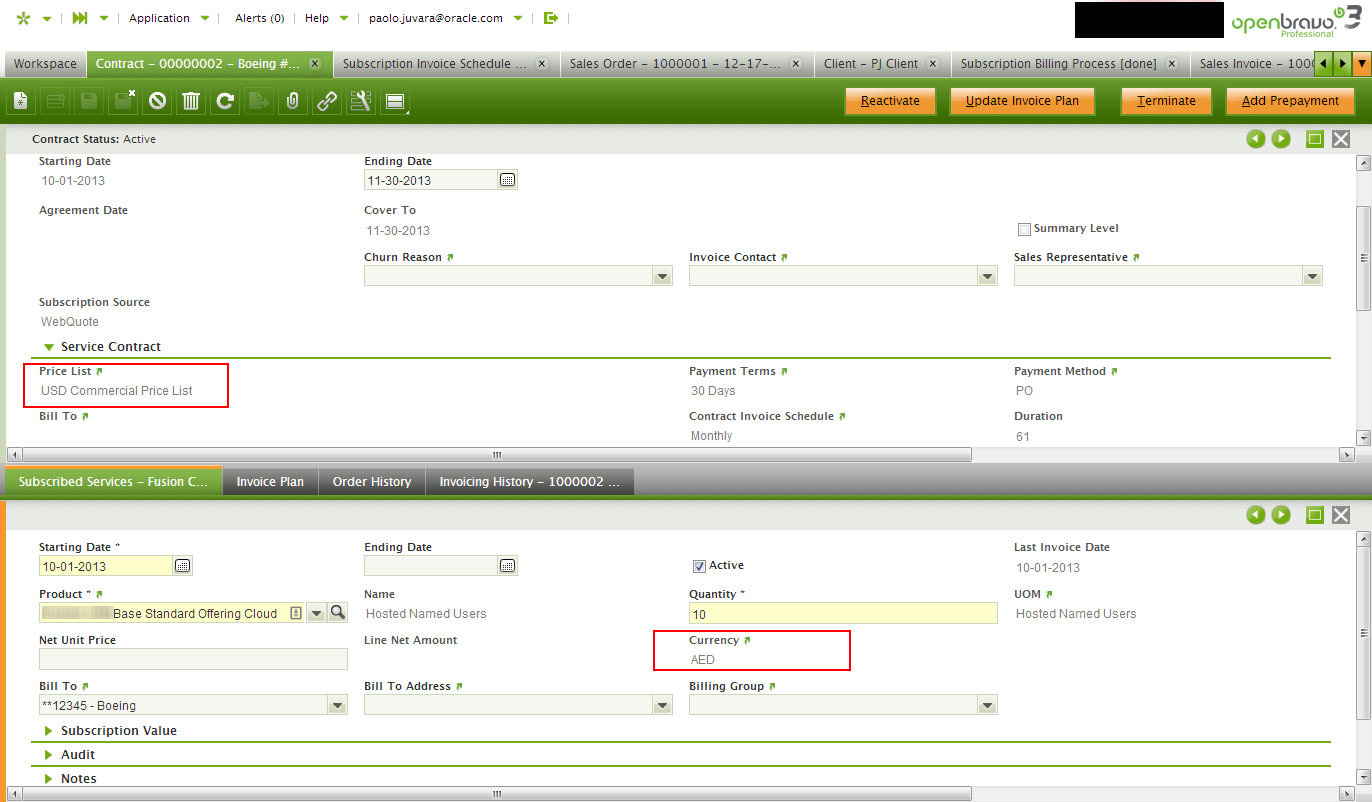 Please notice that if there is a charge associated as a sales order to this contract, the Contract Billing Process is not going to be able to generate a single invoice. The invoice plan will generate an invoice in AED (incorrect) and the order will be invoiced on a separate invoice in USD. |