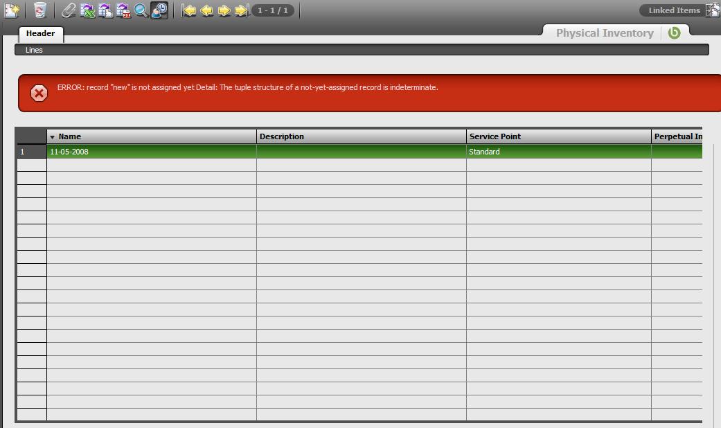 | Description | I first created a Physical Inventory header. After saving, I tried to delete it because I noticed an error. An error message arise. See attach. ERROR: record "new" is not assigned yet Detail: The tuple structure of a not-yet-assigned record is indeterminate. | |||||||