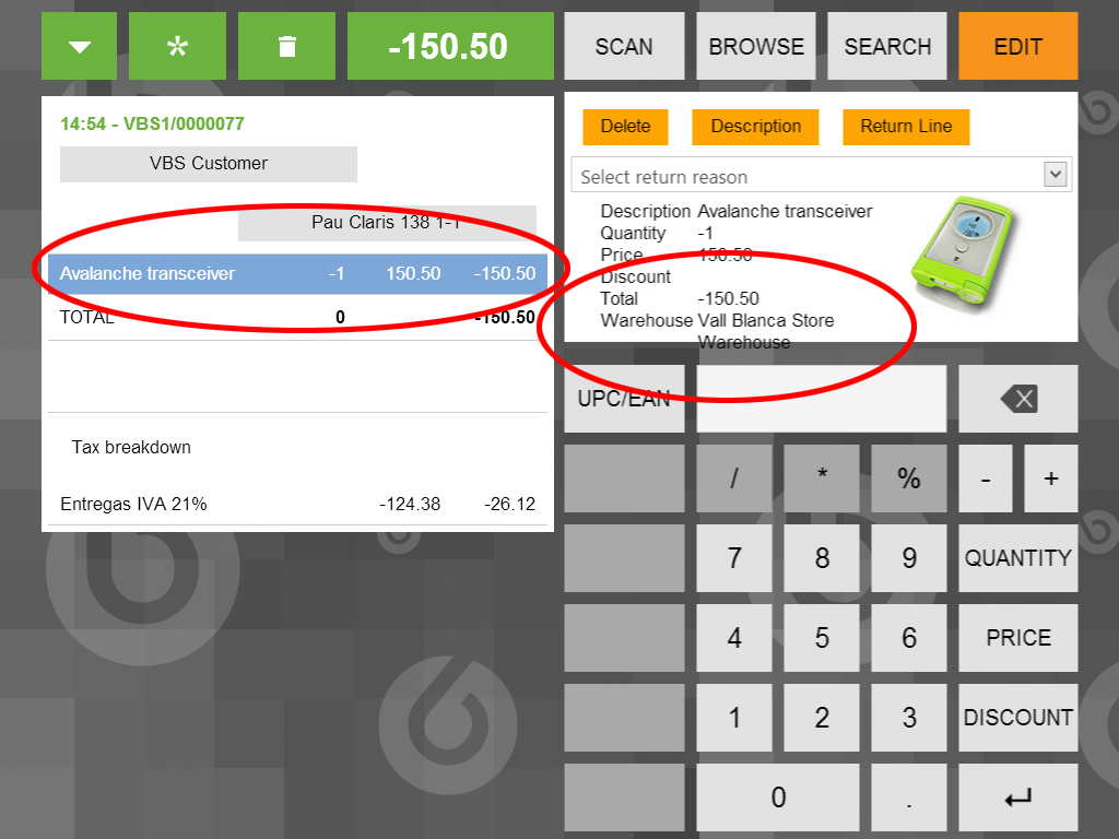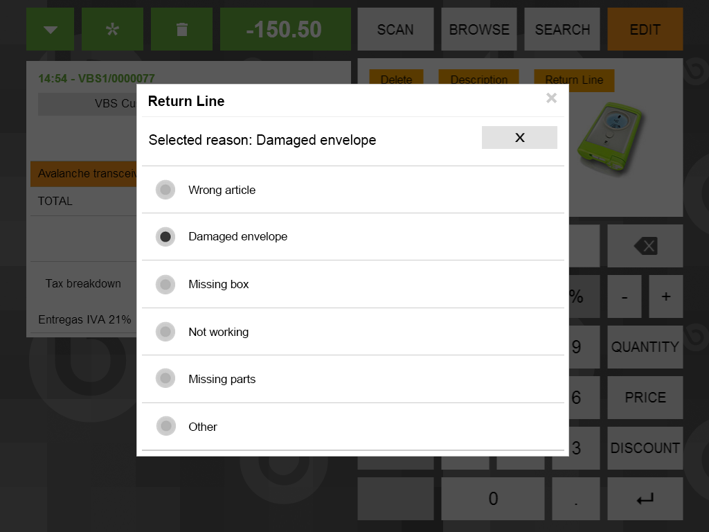 | Description | There are two visualization problems in "Edit" window with "Return Line" button: 1) Once you press the "Return Line" button, the selected line in the ticket that was orange is changed to blue [WebP_Issue_1.png]. It should remain in orange [WebP_Issue_2.png]. 2) In 4:3 screens (iPad) after pressing the "Return Line" button a new combo is displayed that moves the whole content to the button. It only happens with large Description or Warehourse texts, but it is a very common case. [WebP_Issue_1.png] This combo idea should be refactored: * Once the button is pressed, instead of showing the combo, the popup of the attached [WebP_Issue_3.png] should be shown. * In this popup you see the previous selected value (if any) and a X grey button that cleans this selection * One any value (or the X grey button) is selected, the popup is automatically closed and the system assumes this value. This approach has the lack that you cannot directly see the return reason unless you press the button, but since it is not a common feature and the possibility of break the layout is more important than the need of one step (vs two) when there is a need of display the return reason. | |||||||