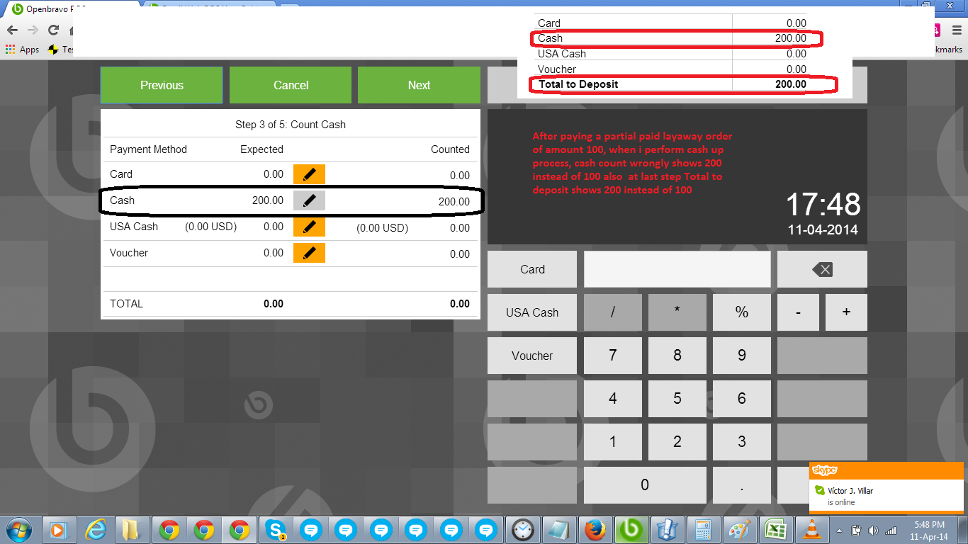 | 2014-04-11 17:08 | sureshbabu | File Added: After paying a partial paid layaway order of amount 100, when i perform cash up process, cash count wrongly shows 200 instead of 100 also at last step Total to deposit shows 200 instead of 100.png | |