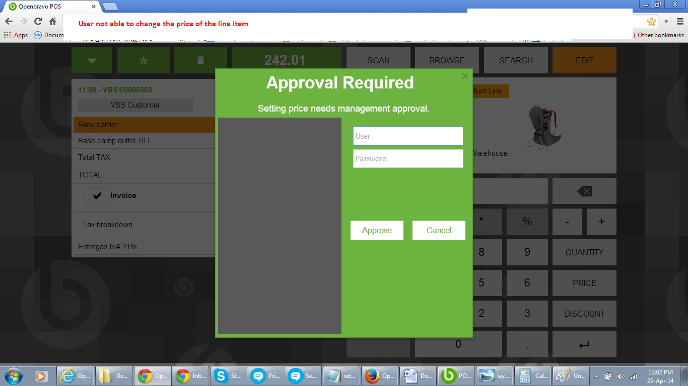 Repository: erp/pmods/org.openbravo.retail.posterminal.cds Changeset: 6734a59da24f429628496d3cad8acf2726ad48db Author: Adrián Romero <adrianromero <at> openbravo.com> Date: Mon Apr 28 16:29:13 2014 +0200 URL: http://code.openbravo.com/erp/pmods/org.openbravo.retail.posterminal.cds/rev/6734a59da24f429628496d3cad8acf2726ad48db [^] Fixes issue 0026375: [RR14Q2] User not able to change the price of the line item Fixes issue 0026376: [RR14Q2] user not able to delete a line item In case that a action that requires management approval does not have any manager properly configured, a message is displayed informing the user that the actionn cannot be executed becuase he does not have the rights to execute it --- M web/org.openbravo.retail.posterminal/js/components/obpos-approval.js --- |