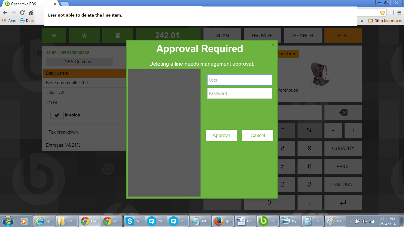 Repository: erp/pmods/org.openbravo.retail.posterminal.cds Changeset: 6734a59da24f429628496d3cad8acf2726ad48db Author: Adrián Romero <adrianromero <at> openbravo.com> Date: Mon Apr 28 16:29:13 2014 +0200 URL: http://code.openbravo.com/erp/pmods/org.openbravo.retail.posterminal.cds/rev/6734a59da24f429628496d3cad8acf2726ad48db [^] Fixes issue 0026375: [RR14Q2] User not able to change the price of the line item Fixes issue 0026376: [RR14Q2] user not able to delete a line item In case that a action that requires management approval does not have any manager properly configured, a message is displayed informing the user that the actionn cannot be executed becuase he does not have the rights to execute it --- M web/org.openbravo.retail.posterminal/js/components/obpos-approval.js --- |