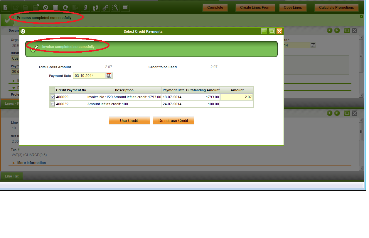 | Description | When completing a Sales Invoice for a customer that has available credit a success message is shown in both the pop up and the main tab. But those message are different (see attach) | |||||||||||