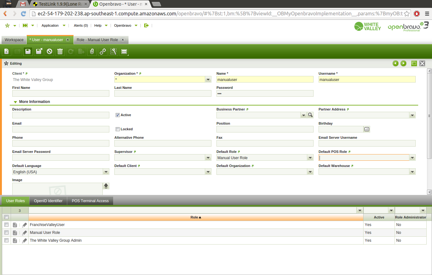 | Steps To Reproduce | To have a user to test this: n POS backend: [RR14Q4] Login into ERP System: "Username": Openbravo "Password": openbravo Change the role as “The White Valley Group Admin” Navigate to User window (General Setup || Security || User) Create a new record (Ctrl + D) To create a new user, enter the below user details Client: The White Valley Group Organization: * Name: manualuser Username: manualuser Password: openbravo Click Ctrl + s to save the details Then navigate to POS Terminal Access tab Click Ctrl + D to add a new record Then enter POS Terminal: CMS POS Terminal (This will depend on your terminal) Click Ctrl + S to save the details Navigate to Role window (General Setup || Security || Role) Create a new record by clicking the hot keys Ctrl + D To create a new user role, enter the below user details Client: The White Valley Group Organization: * Name: Manual User Role User level: Organization Manual: Checked Restricted Backend access: Checked Click Ctrl + s to save the details Then navigate to Org Access tab Click Create one link to add new record Organization: Central Mountains Store (This again depends on your terminal) (I will assume that you are using CMS-1 POS terminal) Organization Administrator: No Then navigate to User Assignment tab Click Create one link to add new record Then select below details User/Contact: manualuser Role Administrator: Unchecked Then navigate to Form Access Click Create one link to add new record Then select below details Special Form: Web POS Click Ctrl + s to save the details Go again to User window, select manualuser record and go to "User Roles" tab. Create new record and add "the white valley group admin" role and set it as active. Create new record and add "FranchiseValleyUser" role and set it as active. (Now you should have 3 roles: "manual user role", "the white valley group admin" and "FranchiseValleyUser"). -- Now go to POS and log in as manualuser/openbravo. Assuming that your default role is "Manual User Role", select in POS Menu | "User" | "Profile" and you select a role different than the one already recorded in the POS backend. For example, "The White Valley Group Admin", "Set as default" and apply it. That change is recorded in "Default Role" backend field (In User window, more information area), BUT when you enter to POS, the field that is used to assign you a role is "Default POS Role". For checking this fields, you must login POS backend as Openbravo/openbravo and use "The white valley group admin" as role. Then go to User window, choose the manualuser record and check "more information" area. | |||||||