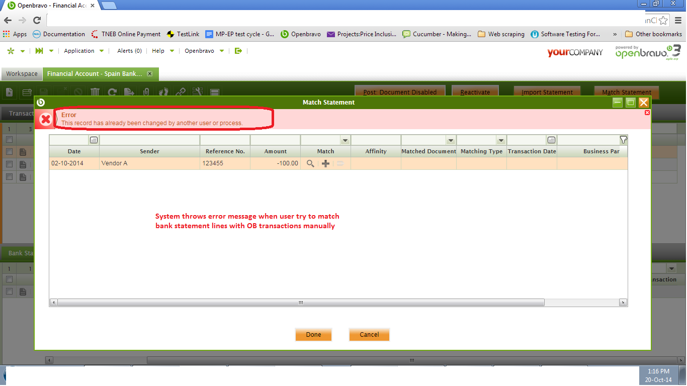 | Steps To Reproduce | Go to Financial Account Window. Select Spain Bank financial account Create a Transaction Manually in Transaction Tab: Transaction Type: BP Withdrawal GL Item: Salaries Withdrawal Amount: 100.00 Business Partner: Vendor A Transaction Date: Today Process the Transaction Create a Bank Statement Header: Name: TestReconciliationWith002 Transaction Date: 02/10/2014 Create a Bank Statement Line: Transaction Date: 02/10/2014 Reference No.: 123456 Business Partner: Vendor A GL Item: Salaries Amount Out: 100.00 Process the Bank Statement Click on Match Statement Button. Do you want the algorithm to be run against unmatched bank statement lines? Click Cancel The Bank Statement Line appears on Match Statement grid 4 Click on Magnifying glass button in the line, Expected : "Match to a not cleared transaction". Actual: But right now system throws error as "Error This record has already been changed by another user or process." | |||||||