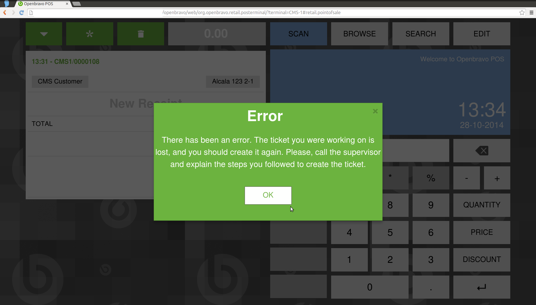 | Steps To Reproduce | (I assume that you are using CMS-1 terminal) Login to CMS-1 POS terminal as centralmountains/openbravo. Click to BROWSE and click menu "Backpacks & Travel". Pick 1 item of "Alpine skiing backpack 27L" and 1 item of "Baby carrier". Now click in "Alpine skiing backpack 27L" line, click PRICE and set 110.50. (Now you will have those two diferent items with the same price). Click "Baby carrier" line and at the right of the screen click "Return Line" button. After that, click in total amount (0.00) to complete the receipt. And now click "Done" button. The error popup has appeared. --- This also happends if you choose a single unit of some product and you set its price to 0.00 and you try to complete the receipt. --- It is also possible to reproduce that issue if you just add a product whose price is 0. | |||||||