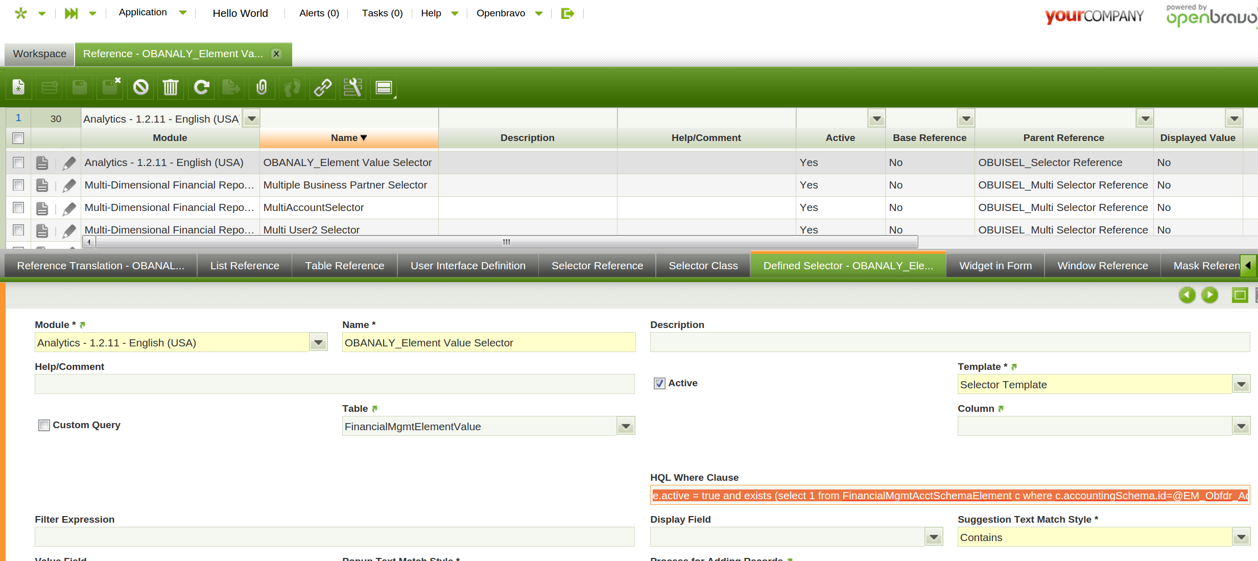 | Description | - a selector with a where clause with a parameter which is stored in the context, for example this where clause: e.active = true and exists (select 1 from FinancialMgmtAcctSchemaElement c where c.accountingSchema.id=@EM_Obfdr_Acctschema_ID@ and c.accountingElement.id = e.accountingElement.id) - the parameter name ends with _ID therefore the advancedquerybuilder tries to resolve it against a entity which does not work - the exception is actively ignored and the next if will get the value correctly from the context. This is correct. The problem is that the log shows an error while the value is present in the context correctly. 250403 [http-8080-6] ERROR org.openbravo.base.util.CheckException - Property with EM_Obfdr_Acctschema_ID does not exist for entity OBANALY_Cube_Rep_Dim org.openbravo.base.util.CheckException: Property with EM_Obfdr_Acctschema_ID does not exist for entity OBANALY_Cube_Rep_Dim at org.openbravo.base.util.Check.isNotNull(Check.java:72) at org.openbravo.base.model.Entity.getPropertyByColumnName(Entity.java:572) at org.openbravo.service.json.AdvancedQueryBuilder.substituteContextParameters(AdvancedQueryBuilder.java:1200) at org.openbravo.service.json.AdvancedQueryBuilder.substituteParameters(AdvancedQueryBuilder.java:362) at org.openbravo.service.json.AdvancedQueryBuilder.getWhereClause(AdvancedQueryBuilder.java:209) at org.openbravo.service.json.AdvancedQueryBuilder.getJoinClause(AdvancedQueryBuilder.java:1302) at org.openbravo.service.json.DataEntityQueryService.buildOBQuery(DataEntityQueryService.java:125) at org.openbravo.service.json.DataEntityQueryService.list(DataEntityQueryService.java:108) at org.openbravo.service.json.DefaultJsonDataService.fetch(DefaultJsonDataService.java:200) at org.openbravo.service.datasource.DefaultDataSourceService.fetch(DefaultDataSourceService.java:72) at org.openbravo.service.datasource.DataSourceServlet.doFetch(DataSourceServlet.java:261) at org.openbravo.service.datasource.DataSourceServlet.doPost(DataSourceServlet.java:744) at javax.servlet.http.HttpServlet.service(HttpServlet.java:637) at org.openbravo.base.HttpBaseServlet.serviceInitialized(HttpBaseServlet.java:225) at org.openbravo.base.secureApp.HttpSecureAppServlet.service(HttpSecureAppServlet.java:449) at org.openbravo.client.kernel.BaseKernelServlet.callServiceInSuper(BaseKernelServlet.java:92) at org.openbravo.client.kernel.BaseKernelServlet.service(BaseKernelServlet.java:63) at org.openbravo.service.datasource.DataSourceServlet.service(DataSourceServlet.java:140) at javax.servlet.http.HttpServlet.service(HttpServlet.java:717) at org.apache.catalina.core.ApplicationFilterChain.internalDoFilter(ApplicationFilterChain.java:290) at org.apache.catalina.core.ApplicationFilterChain.doFilter(ApplicationFilterChain.java:206) at org.codehaus.enunciate.webapp.HTTPRequestContextFilter.doFilter(HTTPRequestContextFilter.java:36) at org.apache.catalina.core.ApplicationFilterChain.internalDoFilter(ApplicationFilterChain.java:235) at org.apache.catalina.core.ApplicationFilterChain.doFilter(ApplicationFilterChain.java:206) at org.openbravo.client.analytics.OBSpringSecurityContextRequestFilter$1.doAction(OBSpringSecurityContextRequestFilter.java:71) at org.openbravo.dal.core.ThreadHandler.run(ThreadHandler.java:46) at org.openbravo.client.analytics.OBSpringSecurityContextRequestFilter.doFilter(OBSpringSecurityContextRequestFilter.java:79) at org.apache.catalina.core.ApplicationFilterChain.internalDoFilter(ApplicationFilterChain.java:235) at org.apache.catalina.core.ApplicationFilterChain.doFilter(ApplicationFilterChain.java:206) at org.openbravo.activiti.OBActivitiRequestFilter$1.doAction(OBActivitiRequestFilter.java:68) at org.openbravo.dal.core.ThreadHandler.run(ThreadHandler.java:46) at org.openbravo.activiti.OBActivitiRequestFilter.doFilter(OBActivitiRequestFilter.java:81) at org.apache.catalina.core.ApplicationFilterChain.internalDoFilter(ApplicationFilterChain.java:235) at org.apache.catalina.core.ApplicationFilterChain.doFilter(ApplicationFilterChain.java:206) at org.openbravo.utils.SessionExpirationFilter.doFilter(SessionExpirationFilter.java:66) at org.apache.catalina.core.ApplicationFilterChain.internalDoFilter(ApplicationFilterChain.java:235) at org.apache.catalina.core.ApplicationFilterChain.doFilter(ApplicationFilterChain.java:206) at org.openbravo.utils.CharsetFilter.doFilter(CharsetFilter.java:35) at org.apache.catalina.core.ApplicationFilterChain.internalDoFilter(ApplicationFilterChain.java:235) at org.apache.catalina.core.ApplicationFilterChain.doFilter(ApplicationFilterChain.java:206) at org.openbravo.client.kernel.KernelFilter$1.doAction(KernelFilter.java:62) at org.openbravo.dal.core.ThreadHandler.run(ThreadHandler.java:46) at org.openbravo.client.kernel.KernelFilter.doFilter(KernelFilter.java:71) at org.apache.catalina.core.ApplicationFilterChain.internalDoFilter(ApplicationFilterChain.java:235) at org.apache.catalina.core.ApplicationFilterChain.doFilter(ApplicationFilterChain.java:206) at org.openbravo.dal.core.DalRequestFilter$1.doAction(DalRequestFilter.java:81) at org.openbravo.dal.core.ThreadHandler.run(ThreadHandler.java:46) at org.openbravo.dal.core.DalRequestFilter.doFilter(DalRequestFilter.java:103) at org.apache.catalina.core.ApplicationFilterChain.internalDoFilter(ApplicationFilterChain.java:235) at org.apache.catalina.core.ApplicationFilterChain.doFilter(ApplicationFilterChain.java:206) at org.apache.catalina.core.StandardWrapperValve.invoke(StandardWrapperValve.java:233) at org.apache.catalina.core.StandardContextValve.invoke(StandardContextValve.java:191) at org.apache.catalina.core.StandardHostValve.invoke(StandardHostValve.java:127) at org.apache.catalina.valves.ErrorReportValve.invoke(ErrorReportValve.java:102) at org.apache.catalina.core.StandardEngineValve.invoke(StandardEngineValve.java:109) at org.apache.catalina.connector.CoyoteAdapter.service(CoyoteAdapter.java:298) at org.apache.coyote.http11.Http11Processor.process(Http11Processor.j