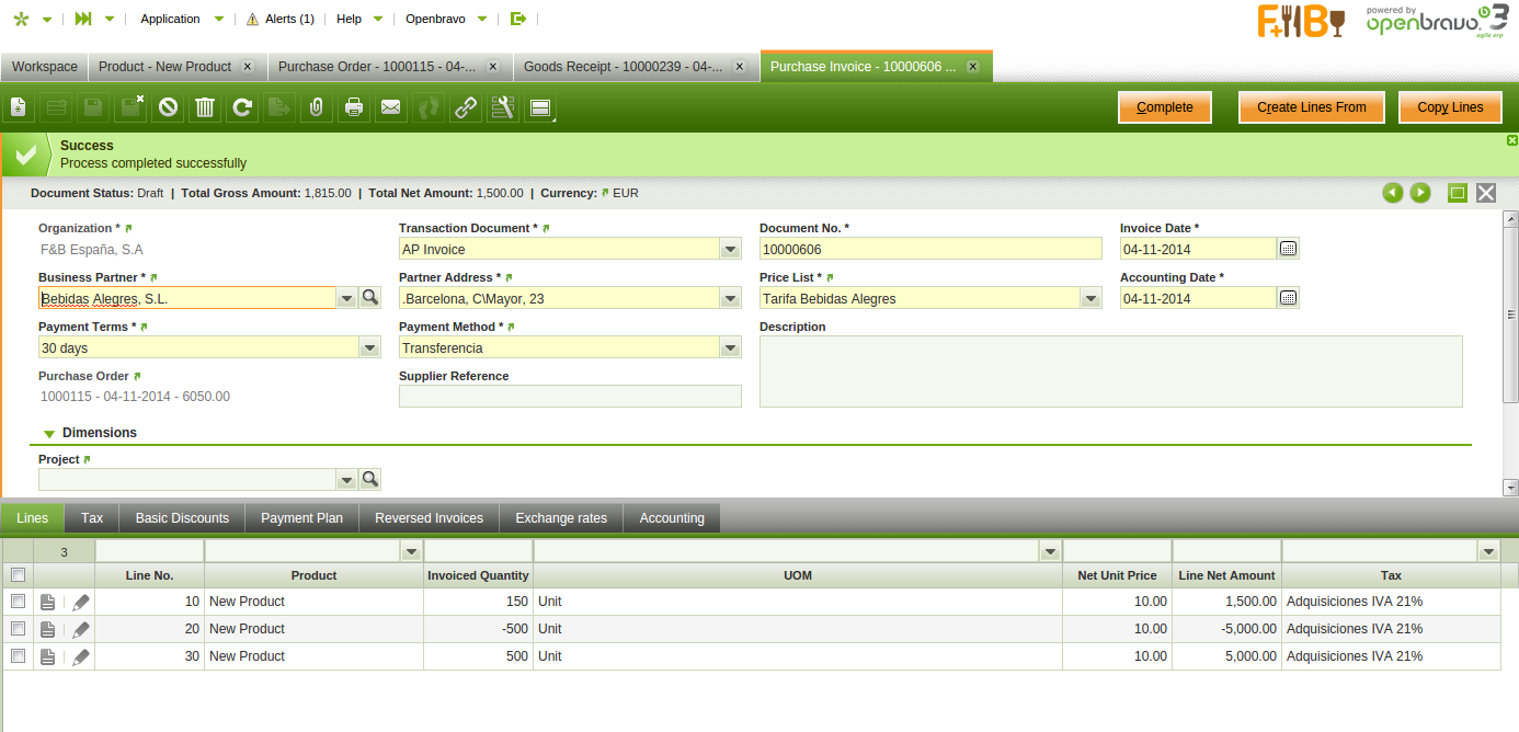 Test plan 1: 1. Create a Purchase Order, add a product to it and book it 2. Create a Goods Receipt from it, complete it and void it 3. Create a Purchase Invoice header, select the previously created order and check just one line is shown. Notice that the whole ordered quantity has been invoiced, as consequence the purchase invoice total gross amount match the total amount of the selected order. Test Plan 2: As F&B International Group Admin 1. Go to Product window. Create a new product named "New Product". Select F&B España organization while creating the product. Go to Price tab and select "Tarifa Bebidas Alegres". Enter a unit/list price of 10.00. 2. Go to Purchase order window Create a new order for F&B España. Select "New product" and "Bebidas Alegres" business partner. Enter a quantity of 500 units. Select "Compras exentas" tax Book the order. Notice Total Gross Amount is 5000. 3. Go to Goods Receipt window Create a new receipt for "F&B España" and "Bebidas Alegres" business partner. Use "Create Lines From" process button and select the order. Receipt all quantity, that is 500 Units. Enter a Storage Bin. Complete the receipt. Void the Receipt by using the process button "Close" and then Void. 4. Go to Purchase Invoice window Create a new one for "F&B España" and "Bebidas Alegres" business partner. Click on "Create Lines From". Select the previously created order. Press OK. Check that only one line was created in Lines tab related to the 500 units actually receipt and Total Gross amount is the same than the order: 5000. 5. You can complete the invoice successfully. Test Plan 3: One shipment voided and another one partially shipped. 1. Go to Product window. Create a new product named "New Product". Select F&B España organization while creating the product. Go to Price tab and select "Tarifa Bebidas Alegres". Enter a unit/list price of 10.00. 2. Go to Purchase order window Create a new order for F&B España. Select "New product" and "Bebidas Alegres" business partner. Enter a quantity of 500 units. Select "Compras exentas" tax Book the order. Notice Total Gross Amount is 5000. 3. Go to Goods Receipt window Create a new receipt for "F&B España" and "Bebidas Alegres" business partner. Use "Create Lines From" process button and select the order. Receipt all quantity, that is 500 Units. Enter a Storage Bin. Complete the receipt. Void the Receipt by using the process button "Close" and then Void. 4. Enter a new receipt for "F&B España" and "Bebidas Alegres" business partner. Use "Create Lines From" process button and select the order. Receipt 150 units. Enter a Storage Bin. Complete the receipt. 5. Go to Purchase Invoice window Create a new one for "F&B España" and "Bebidas Alegres" business partner. Click on "Create Lines From". Select the previously created order. Press OK. Check that only one line was created in Lines tab related to the receipt 150 units and Total Gross amount has been calculted according it: invoiced quantity * product price = 150 * 10 = 1500. 6. You can complete the invoice successfully. |