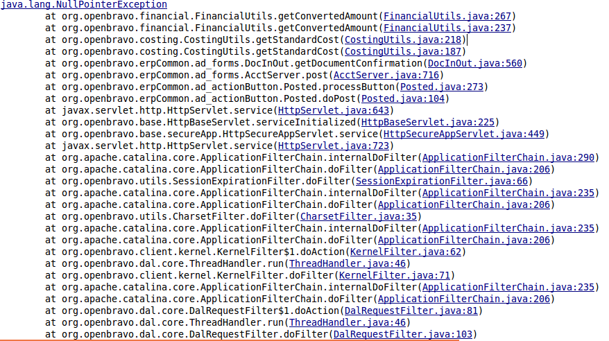 Repository: erp/devel/pi Changeset: 5da17f50c4b06113f285acdbaca01fd572c119fc Author: Alvaro Ferraz <alvaro.ferraz <at> openbravo.com> Date: Fri Dec 05 08:51:10 2014 +0100 URL: http://code.openbravo.com/erp/devel/pi/rev/5da17f50c4b06113f285acdbaca01fd572c119fc [^] Fixes bug 28230 Null Pointer Exception is raised when trying to post a goods receipt When a goods receipt with a product of type Service, which has a cost of type Standard, is posted, the DocInOut class calls the getStandardCost method from CostingUtils class with the currency of the current organization. If the organization has no currency, the client's currency will be used. Otherwise, a null pointer exception will be raised. --- M src/org/openbravo/erpCommon/ad_forms/DocInOut.java M src/org/openbravo/erpCommon/ad_forms/DocMatchInv.java --- |