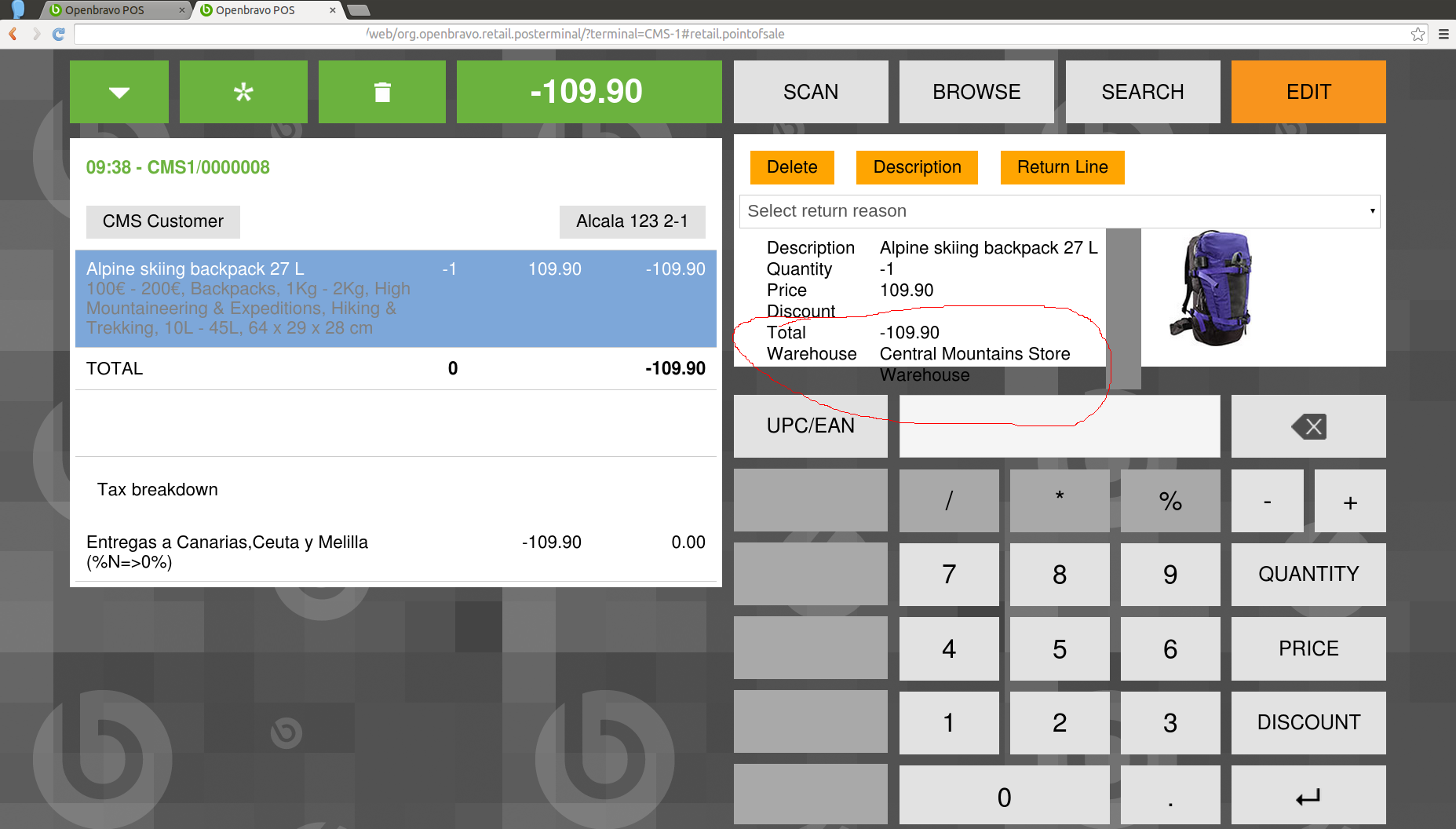 | Steps To Reproduce | Go to WEB POS CMS-1 Terminal. Login as demouser/openbravo. Add an Alpine skiing backpack 27L product. Click in "Alpine skiing backpack 27L" line, then click in "Return Line". Check that this action produces that product's label exceeds its container. | |||||||