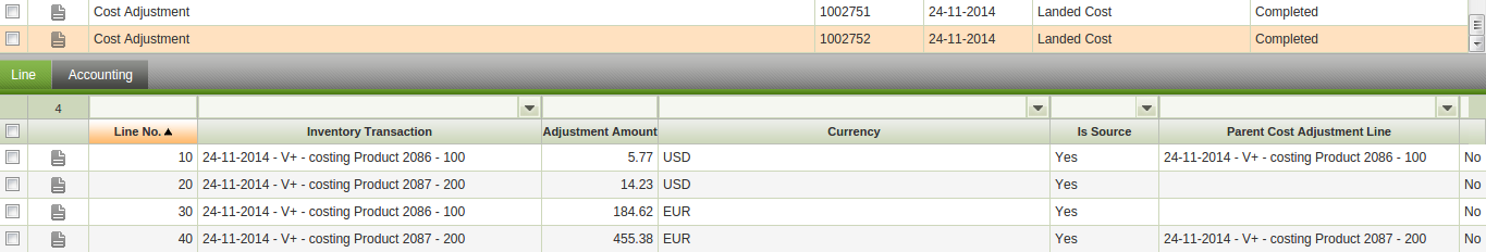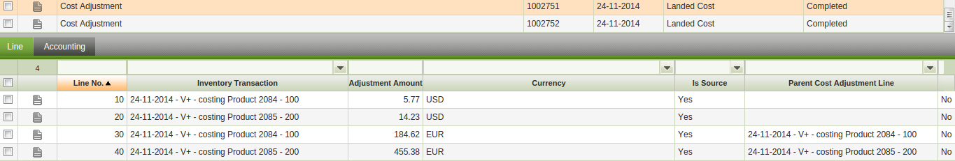 | Steps To Reproduce | In "QA Testing" client: Create a new Product named "Costing LC101" for Spain organization, "Purchase" price list and a unit/list price of 150 €. Create a new Product named "Costing LC201" for Spain organization, "Purchase" price list and a unit/list price of 185 €. Go to Goods Receipt window and create a new receipt dated on 30-11-2014. Create a new line with product "Costing LC101" and quantity 100 units. Create another line with product "Costing LC201" and quantity 200 units. Complete. Let's say this is receipt 10001795. Navigate to Process Request window and run "Costing Background process". Go to receipt window and post the receipt 10001795. Go to Landed Cost window and create a new landed cost for Spain organization, reference date 30-11-2014. Move to Cost tab and add a new line with landed cost type Fees and amount 535 EUR. Add another line with landed cost type Transportation Cost and amount 105 EUR. Add another line with landed cost type USD Cost and amount 20 USD. Move to Receipt tab and add a new line with goods receipt 10001795. Click on Process button. Navigate to Cost Adjustment window and select the last created record. Move to Line tab and realize that there are 4 records: - Line 1: Adjustment Amount: 5.77 - Transaction: Receipt 10001795 line 10 - Parent Cost Adjustment Line: null - Line 2: Adjustment Amount: 14.23 - Transaction: Receipt 10001795 line 20 - Parent Cost Adjustment Line: null - Line 3: Adjustment Amount: 184.62 - Transaction: Receipt 10001795 line 10 - Parent Cost Adjustment Line: Cost Adjustment Line 10 - Line 4: Adjustment Amount: 455.38 - Transaction: Receipt 10001795 line 20 - Parent Cost Adjustment Line: Cost Adjustment Line 20 The field "Parent Cost Adjustment Line" should always have these values in this order, but it has not. | |||||||