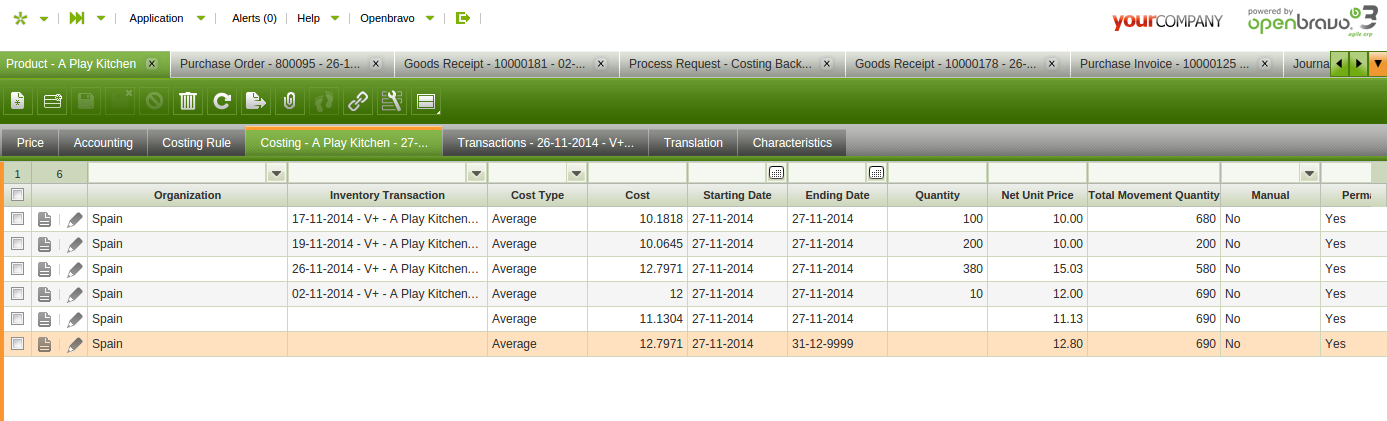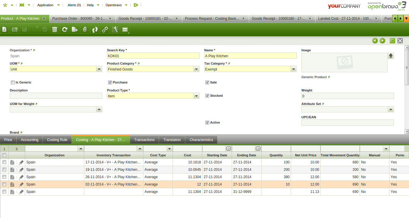 Go to product window, search by product KDK01 and navigate to costing tab. Realize that there are 3 lines.