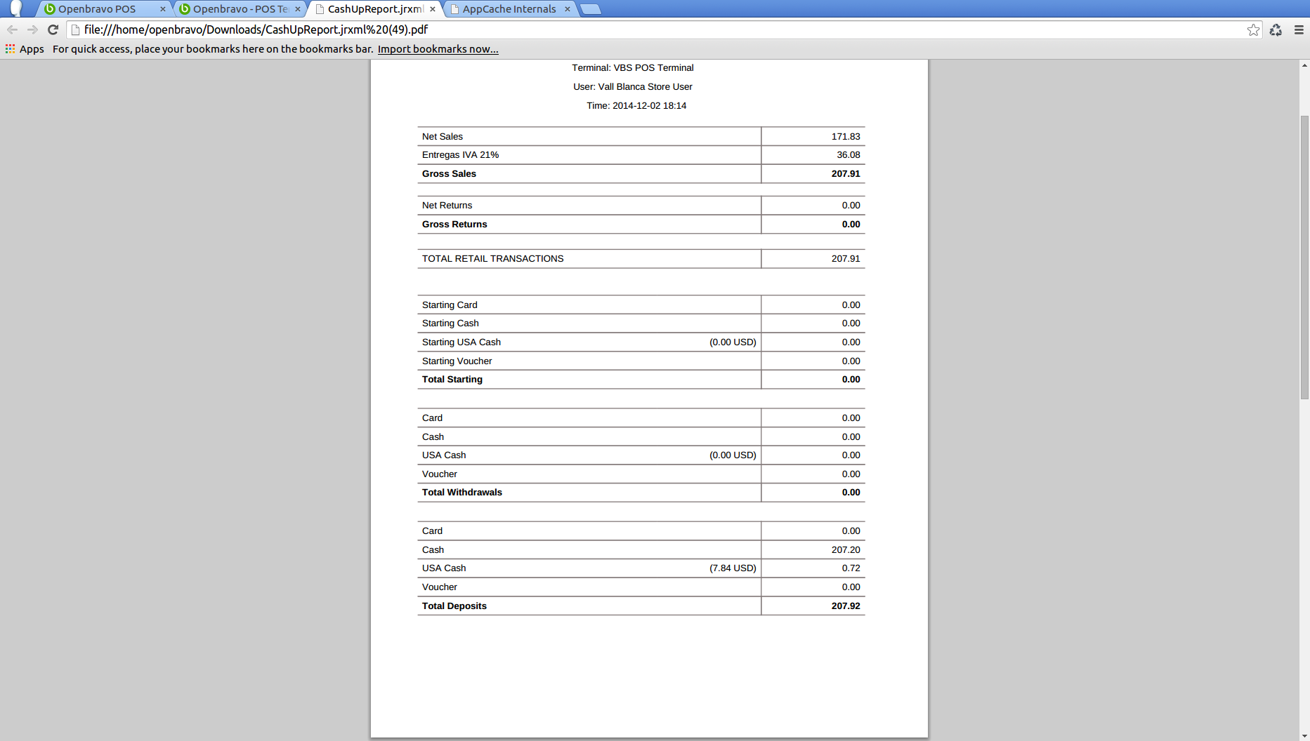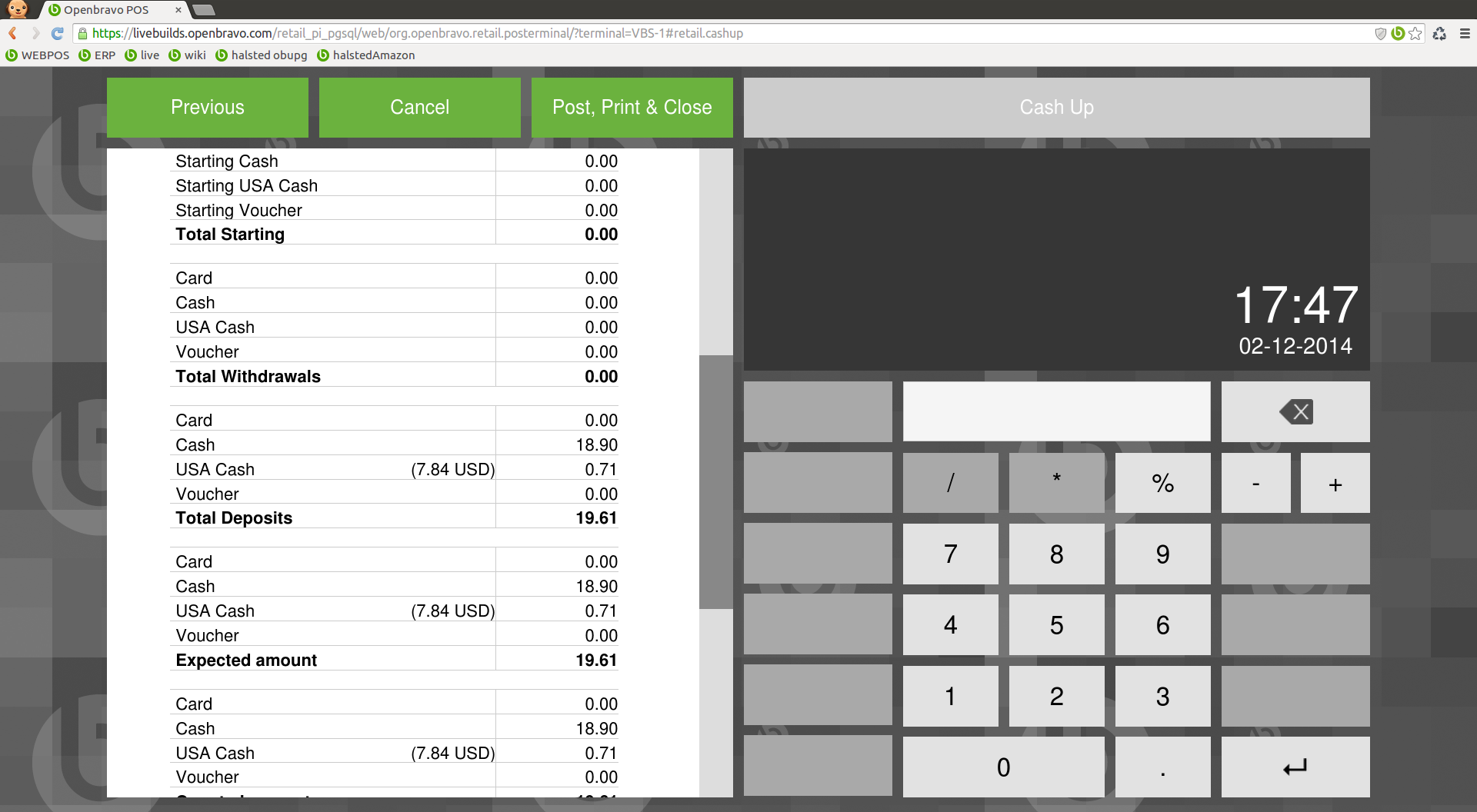 | defect | [Retail Modules] Cash up | major | always | 2014-12-02 18:45 | 2014-12-14 23:40 | |||