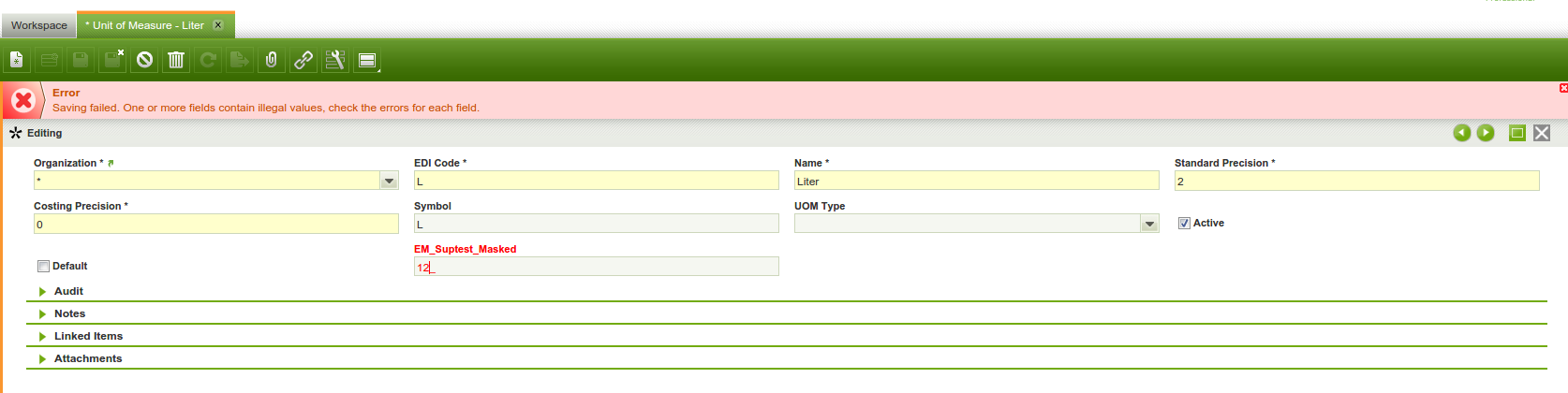 4) Access to the window with the new field in form mode. Enter the following value in the field: 12. Notice that an error is thrown and the record is not saved. (see attached screenshot 1)