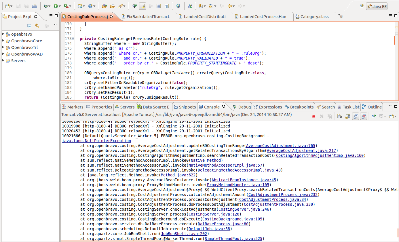 Repository: erp/devel/pi Changeset: 2161bdf912255eb7554b0e691418727a1cceeea5 Author: Unai Martirena <unai.martirena <at> openbravo.com> Date: Wed Dec 31 16:16:00 2014 +0100 URL: http://code.openbravo.com/erp/devel/pi/rev/2161bdf912255eb7554b0e691418727a1cceeea5 [^] Fixes Bug 28487: Fixed Null Pointer Exception. The problem was that in updateBDCostingTimeRange function inside AverageCostAdjustment class, the code was trying to get the movement date of a Inventory Transaction related to a Costing record. But not all costing have Inventory Transaction, so it was giving a NPE. Now, if there is a previous Costing record than the one created due to a backdated transaction, this Costing will be shortened till transaction process date, and the new Backdated costing record will start at that moment. This only happens the first time that a related transaction is found that is not a backdated transaction, because if is done with a backdated transaction time overlap can happen. --- M src/org/openbravo/costing/AverageCostAdjustment.java --- |