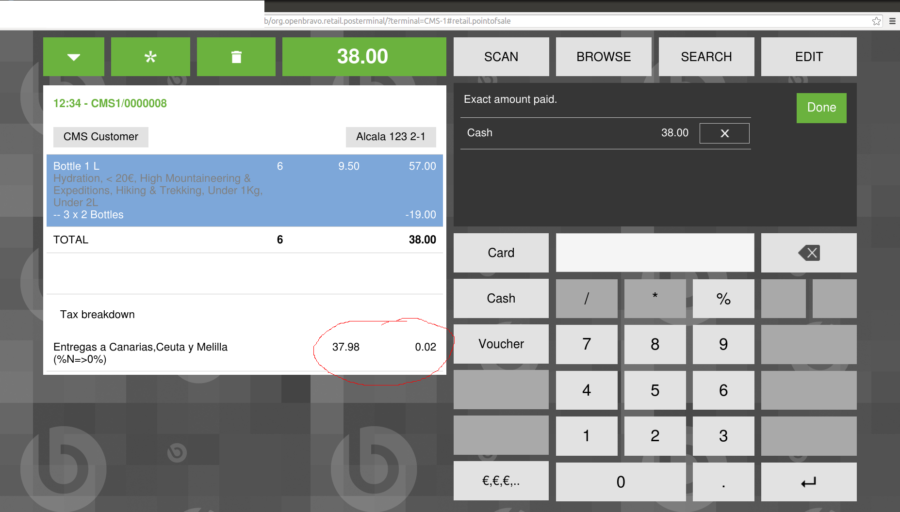 | Steps To Reproduce | Login POS in CMS terminal as centralmountains/openbravo. Add "Bottle 1L" product. Increase amount until 3 units (when the default 3x2 discount is applied). Check in Tax breakdown that result is not correct. | |||||||