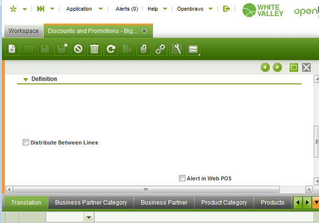 2. Open Discount and Promotions window and go to the Definition section. Take a look at the field distribution, there are two checks, Distribute between lines and Alert in Web POS that are placed in odd places. See screenshot.