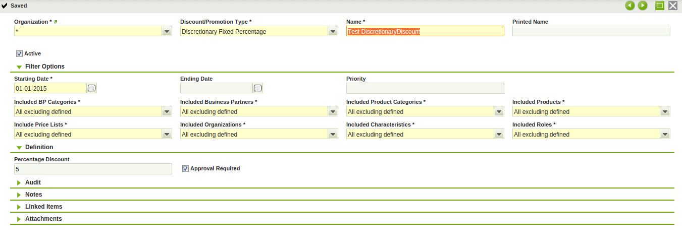 | Proposed Solution | Through this kind of behaviour it is creating two different types of discretionary discounts, those who need to be approved and those who do not. This could be exactly what it is necessary: to split discretionary discounts in theses two groups. But not as the current way, being only split depending on that checkbox. By the other hand, it is too complex for a user to set approval preferences in a real enterprise. We could imagine a "simple" situation where this enterprise would have two organizations. In the first organization only two people can't approve some action and in the second one, only one person can approve that certain action. The simplest situation for that context would require five or more preferences for just this approval preference. (See second attached screenshot). Moreover, there is not possibility to set a hierarchy. It has been assumed that once a person is a supervisor for certain action, he is able to approve that action for every employee, but it can be necessary that "person B" only would be able to approve actions from "person C" and that a "person A" would be able to approve "person B" or similar situations. This is not possible with the current approval preference situation. | |||||||||||