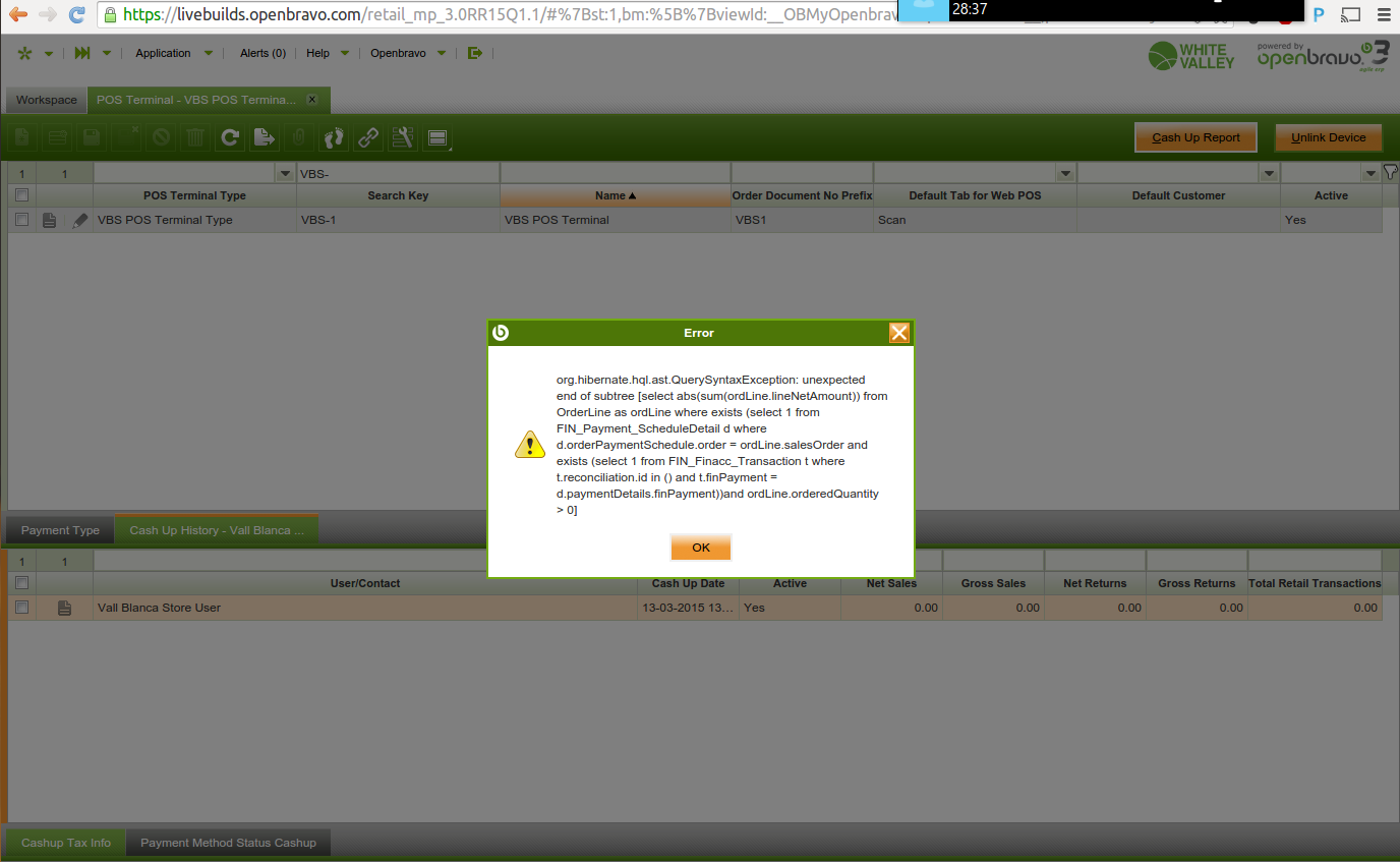 | Steps To Reproduce | * Login on a 15Q1.1 * Go to POS Terminal Window * Go to Cash Up History tab * Select a record that has not been closed Cash Up Report button appears and if you click it the error appears (See image attached) | |||||||