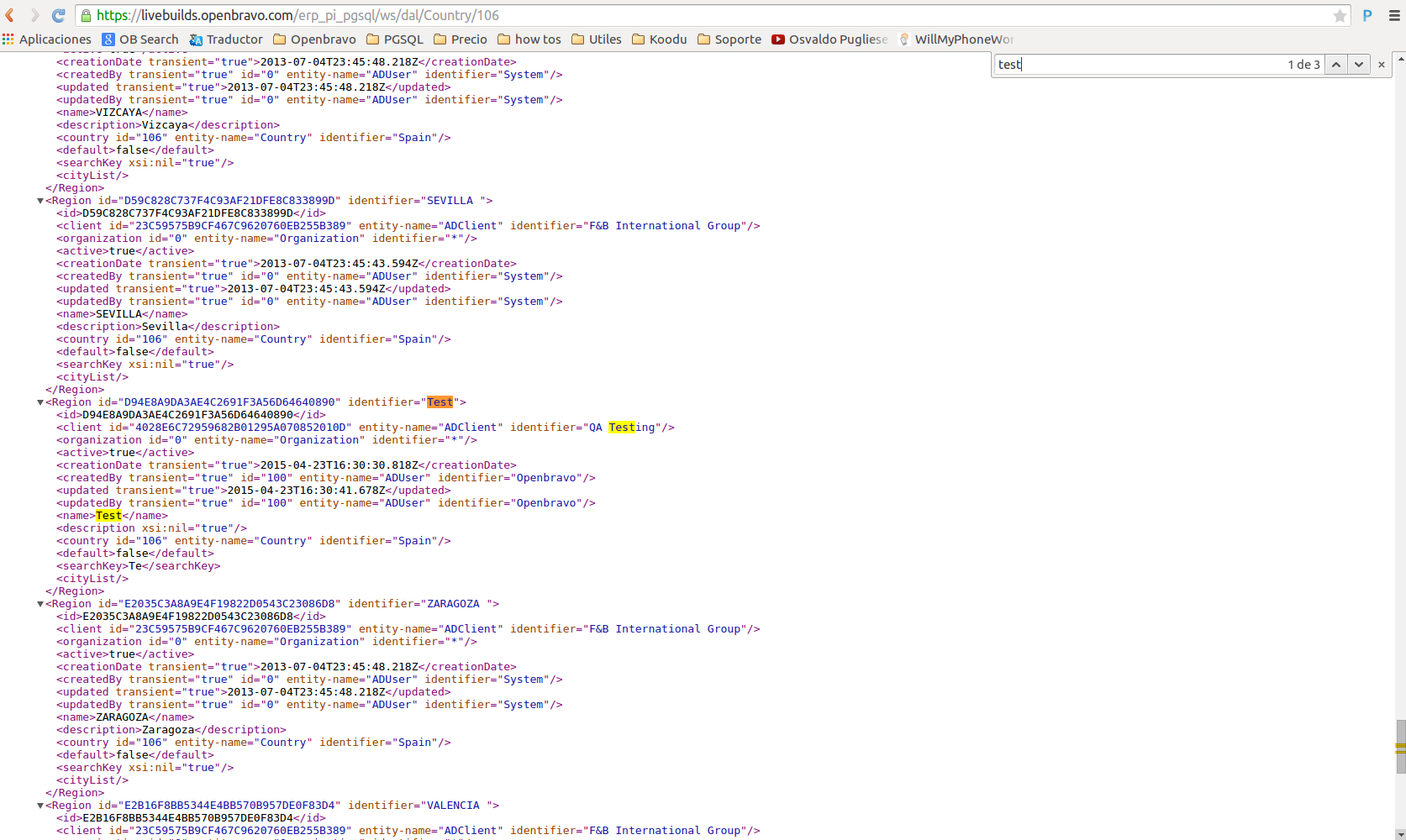 | Steps To Reproduce | 1- Login with role QA testing 2- Go to Window "Country and Regions" 3- Add a new Region for Spain (e.g: Test) 4- Connect to : https://livebuilds.openbravo.com/erp_pi_pgsql/ws/dal/Country/106 [^] 5- Notice that the result is showing data for both F&B and QA Clients, but the default role is from F&B | |||||||