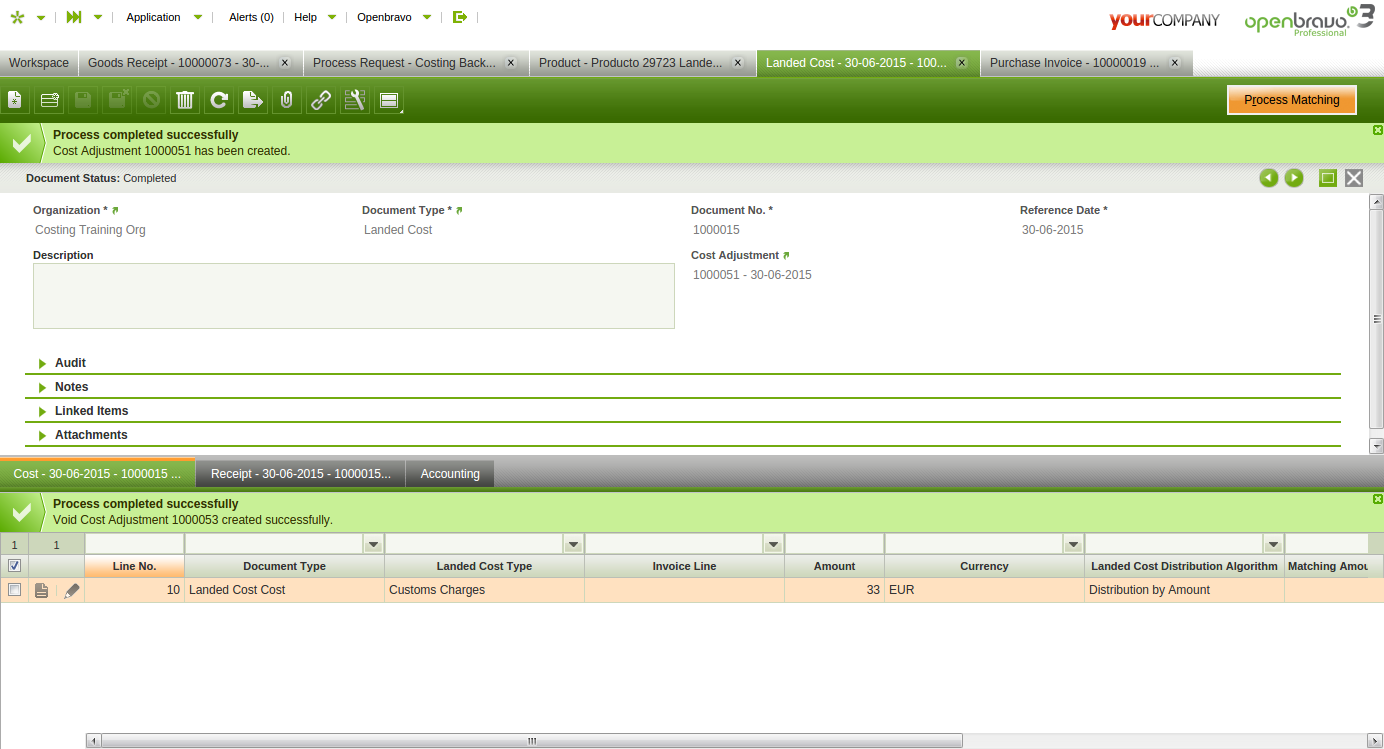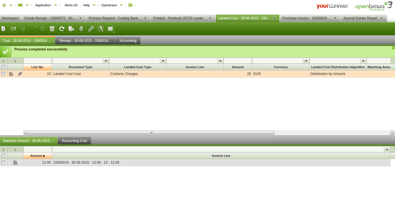 Test Plan above verified for three scenarios below: Actual LC = Estimated LC Actual LC > Estimated LC Actual LC < Estimated LC No cost adjustment is created and correct ledger account (IPV) is used in all three cases. Landed cost feature is working for products valued at "Average" cost. Landed cost are posted to a product asset account, actual vs estimated landed cost differences are also posted to product asset account and the corresponding cost adjustment are created as well. Average cost of the product is adjusted properly. However: (1) In regards to "Creating Landed cost from the Goods Receipt" feature: Landed cost document is not created after completing a Goods Receipt that includes a product valued at Standard Cost and landed cost information in the landed cost tab. Above scenario works in case of a Goods Receipt including a product valued at Average Cost. A landed cost document is created. Please double check. (2) Below scenario is not properly working: Create a product valued at standard cost Create a Goods receipt for that product. Complete and Post the receipt Go to Landed cost window and enter a landed cost amount for that goods receipt Process and Post. Go to purchase invoice window and enter an actual landed cost which do not match the one entered in the landed cost document. Match actual landed cost, select the checks "Is Matching Adjusted" and "Process Matching". Go to landed cost window and post landed cost cost. After than unpost landed cost cost, press cancel matching. Refresh. Realize that it is not possible to process the matching once again from the landed cost cost tab. It is only possible to match from the corresponding purchase invoice. See image attached Issue_29723_1 Above scenario is working for an Average product. It is possible to process the matching once again from landed cost cost. See image Issue 29723_2 Please double check. |