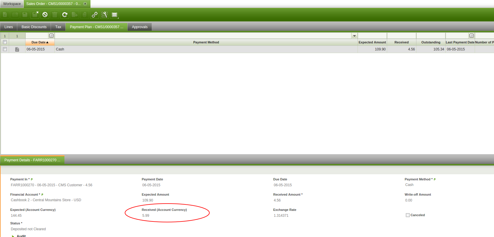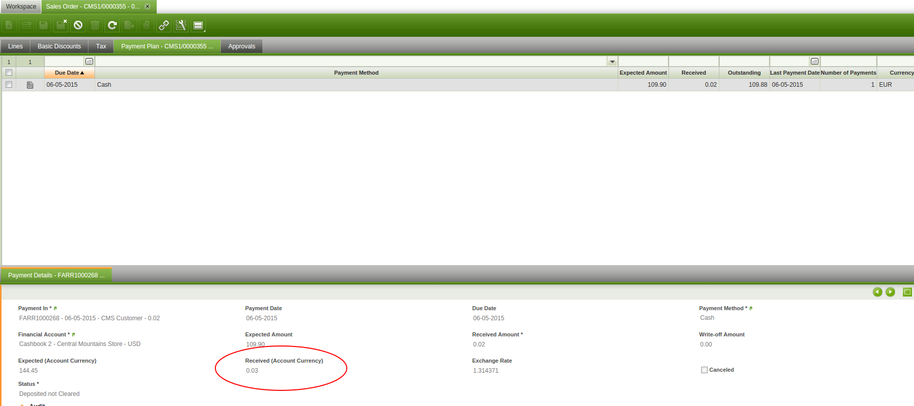 8-Select the just created sales order record and go to "Payment Plan" tab and, after that, go to "Payment Details" tab in form view. In "Received (Account Currency)" field you can confirm 5.99$ are received instead of 6$.