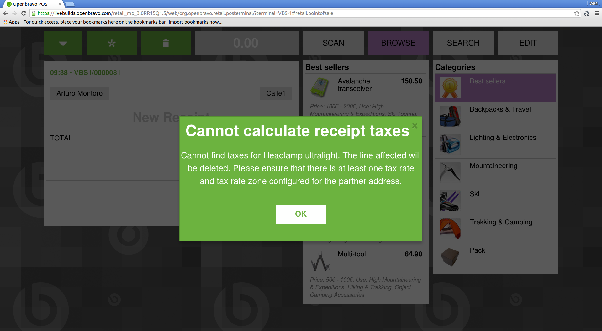 | Description | when a location is updated in web pos using the option: menu -> customer ->edit address, and the location is assigned to the ticket, JS error is returned (see video attached) In version RR15Q1.5, with the same steps no JS error is returned, but pop up with error message is displayed: "Cannot calculate receipt taxes Cannot find taxes for Headlamp ultralight. The line affected will be deleted. Please ensure that there is at least one tax rate and tax rate zone configured for the partner address." (see screenshot attached) | |||||||