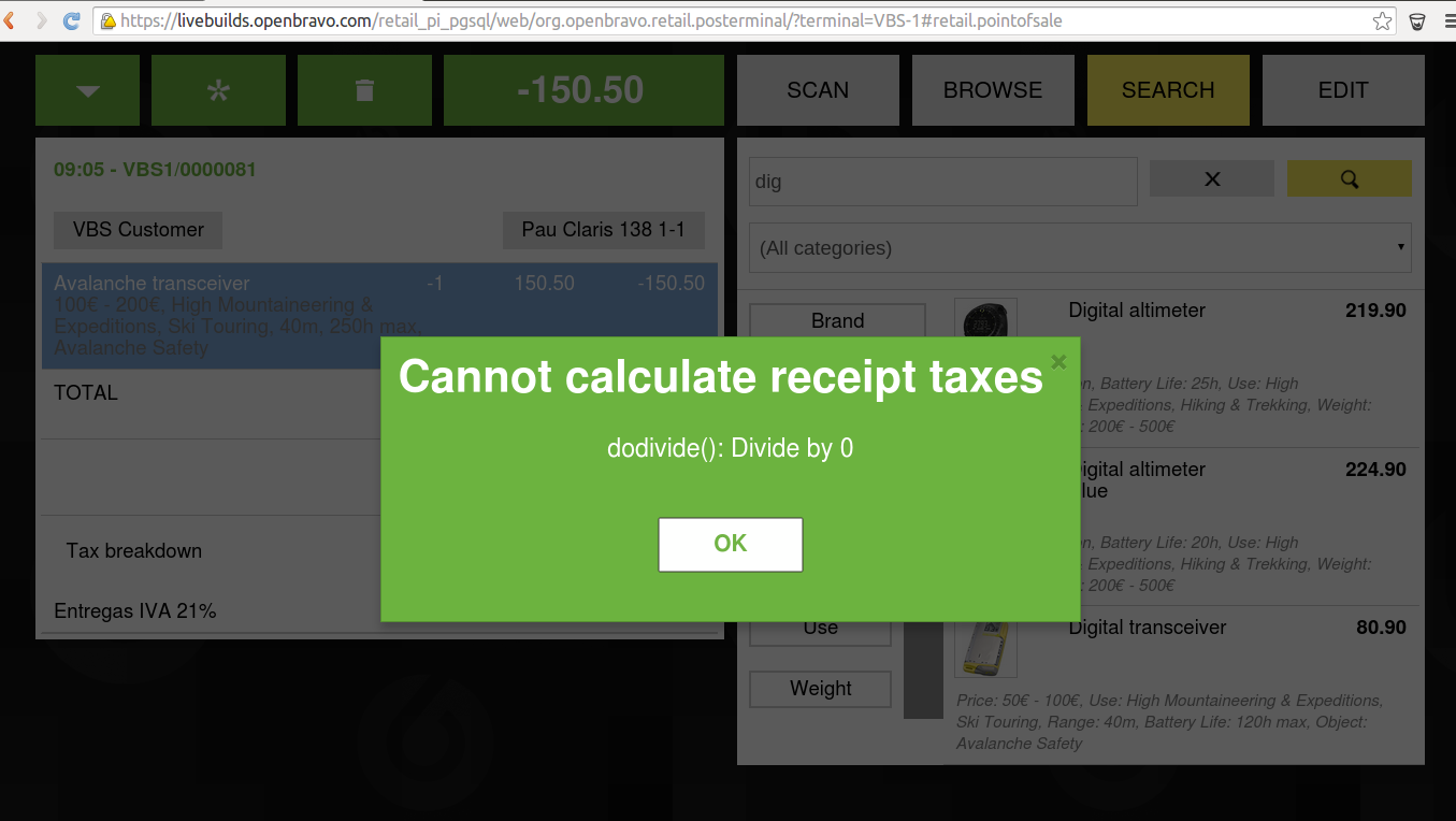 When there is an even number of lines** included before hitting Return this receipt, a "Cannot calculate receipt taxes" popup will be shown.