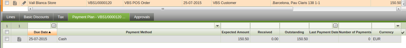 | Steps To Reproduce | 1-Login POS as vallblanca//openbravo. 2-Add 1x "Avalanche transceiver". 3-In dropdown menu, click "Layaway this receipt", click Total Amount button and click in "Layaway" button to layaway that receipt. 4-Click "Pay Open Tickets" option in dropdown menu, select the just created layaway and click "Done". 5-Click in the line of the product and when the "Amount to layaway" popup appears, enter 20 and apply. Then click Ok (tick) button and click Done button. 6-Go to POS backend and login with Openbravo//openbravo. 7-Using "The White Vally Group Admin" role go to "Sales Order" window and select the just created record. 8-Defect: In "Payment Plan" tab, check "Received" & "Outstanding" fields are wrong. | |||||||
