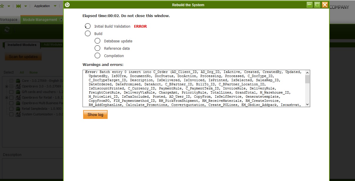 | Steps To Reproduce | The root causes for firing this issue are not known, but it can be seen just by trying to install any module or updating an existent one. On the very start of the build, the first step, Build Validation, fails and an error is shown. The error looks like this: 2015-07-27 19:34:33,040 [Import Entry - 1] ERROR org.hibernate.util.JDBCExceptionReporter - Batch entry 0 insert into C_Order (AD_Client_ID, AD_Org_ID, IsActive, Created, CreatedBy, Updated, UpdatedBy, IsSOTrx, DocumentNo, DocStatus, DocAction, Processing, Processed, C_DocType_ID, C_DocTypeTarget_ID, Description, IsDelivered, IsInvoiced, IsPrinted, IsSelected, SalesRep_ID, DateOrdered, DatePromised, DateAcct, C_BPartner_ID, BillTo_ID, C_BPartner_Location_ID, IsDiscountPrinted, C_Currency_ID, PaymentRule, C_PaymentTerm_ID, InvoiceRule, DeliveryRule, FreightCostRule, DeliveryViaRule, ChargeAmt, PriorityRule, TotalLines, GrandTotal, M_Warehouse_ID, M_PriceList_ID, IsTaxIncluded, Posted, AD_User_ID, CopyFrom, IsSelfService, Generatetemplate, CopyFromPO, FIN_Paymentmethod_ID, RM_PickFromShipment, RM_ReceiveMaterials, RM_CreateInvoice, RM_AddOrphanLine, Calculate_Promotions, Convertquotation, Create_POLines, EM_Obdisc_Addpack, Iscashvat, RM_Pickfromreceipt, EM_APRM_AddPayment, EM_Obpos_Applications_ID, EM_Obpos_App_Cashup_ID, EM_Obpos_Sendemail, EM_Obpos_Createdabsolute, EM_OBPOS_NotInvoiceOnCashUp, C_Order_ID) values ('39363B0921BB4293B48383844325E84C', 'D270A5AC50874F8BA67A88EE977F8E3B', 'Y', '2015-07-25 08:38:16.000000 +00:00:00', '3073EDF96A3C42CC86C7069E379522D2', '2015-07-27 19:34:33.012000 +00:00:00', '3073EDF96A3C42CC86C7069E379522D2', 'Y', 'VBS1/0000120', 'CO', '--', 'N', 'Y', '511A9371A0F74195AA3F6D66C722729D', '511A9371A0F74195AA3F6D66C722729D', '', 'N', 'N', 'Y', 'N', '3073EDF96A3C42CC86C7069E379522D2', '2015-07-25 00:00:00.000000 +00:00:00', '2015-07-25 00:00:00.000000 +00:00:00', '2015-07-25 00:00:00.000000 +00:00:00', 'ABD91C9D3BC94175B876FBBE9CACA008', '2AA7EADDF7EC405899262DDA3E572436', '2AA7EADDF7EC405899262DDA3E572436', 'N', '102', 'B', '8FA47FB95432495596F11D59B686ACEC', 'I', 'A', 'I', 'P', '0', '5', '124.38', '150.50', 'CE7AB151695342FF879938F837F12E6E', '496CF965DF9744D2A41248392D1DE407', 'Y', 'N', '032576220FC44B0DA80145B3265E4D9A', 'N', 'N', 'N', 'N', '45A202BF44884F05B8A1BF741E2063B6', 'N', 'N', 'N', 'N', 'N', 'N', 'N', 'N', 'N', 'N', 'N', '9104513C2D0741D4850AE8493998A7C8', '516157425D119B9E6327A1D34CD6812C', 'N', '2015-07-25 10:38:16.000000 +00:00:00', 'N', '09456D2984F7CC29E6D4BAFA3C611446') was aborted. Call getNextException to see the cause. 2015-07-27 19:34:33,041 [Import Entry - 1] ERROR org.hibernate.util.JDBCExceptionReporter - ERROR: current transaction is aborted, commands ignored until end of transaction block 2015-07-27 19:34:33,044 [Import Entry - 1] WARN org.openbravo.mobile.core.process.DataSynchronizationProcess - Record in process org.openbravo.retail.posterminal.OrderLoader duplicated with id: 09456D2984F7CC29E6D4BAFA3C611446 Error not saved. | |||||||
