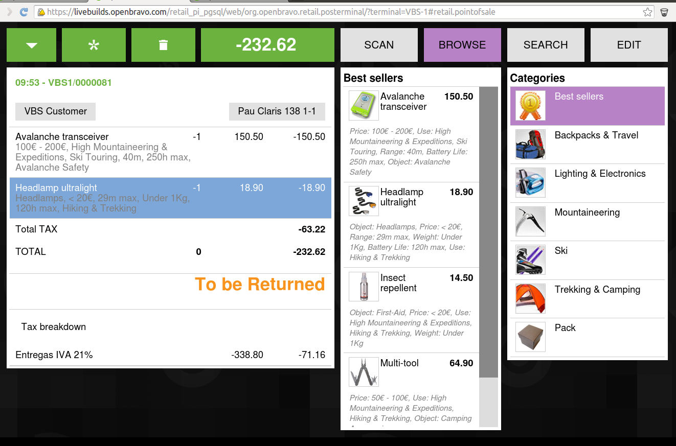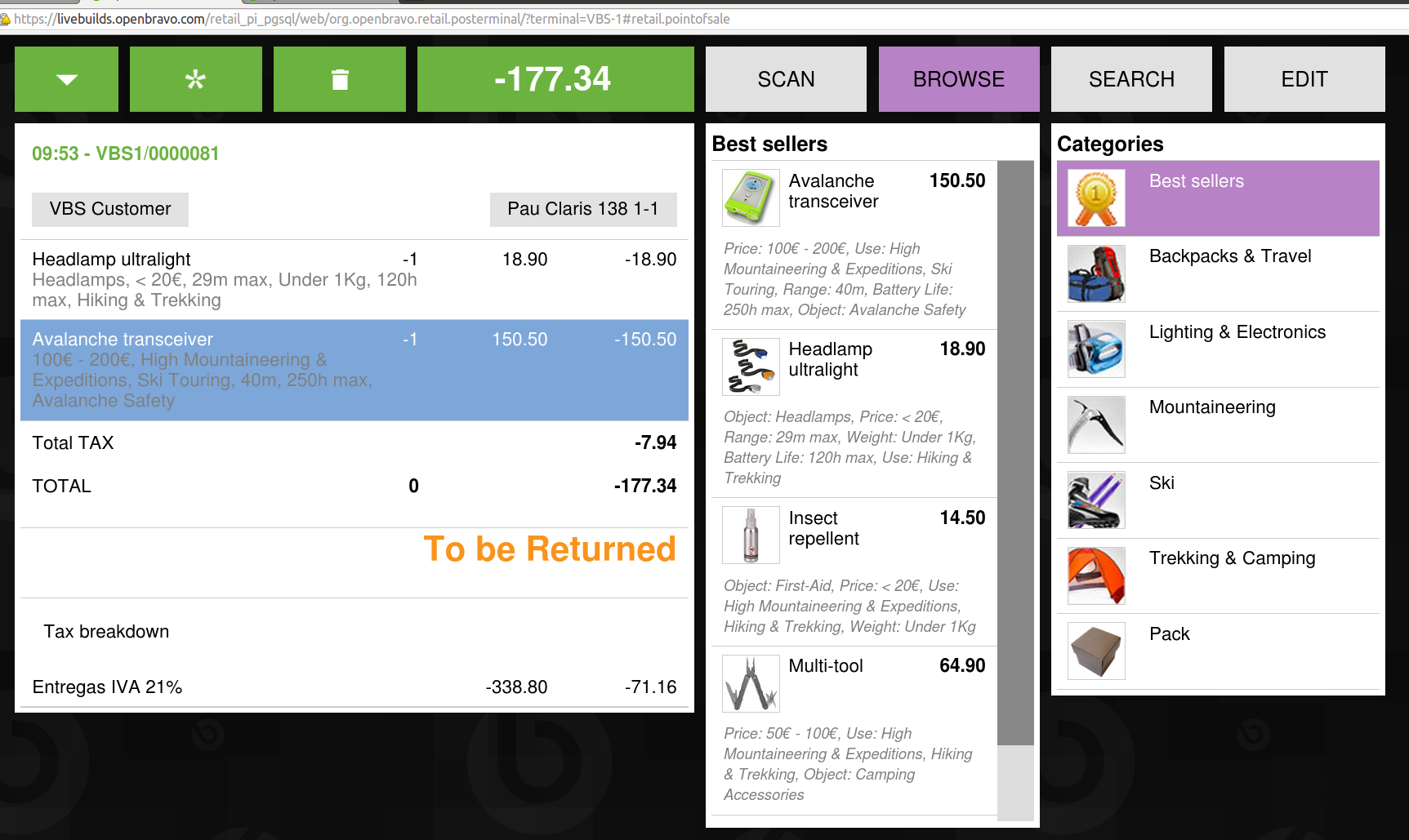 | Steps To Reproduce | Create a ticket. Add products: *Avalanche transceiver (net: 150.5; gross 182.11) *Headlamp ultralight (net: 18.9; gross: 22.87) Verify that the total of the ticket is 204.98 Go to the menu, and tap on return this receipt. Verify that the total of the ticket is NOT -204.98 (check attached screenshots) | |||||||