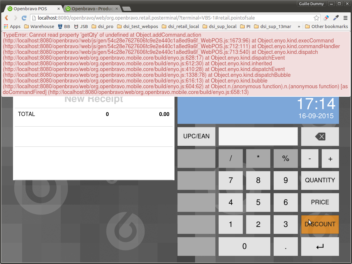 | Steps To Reproduce | set preference to N Log in in web POS Ensure that preference value is false (OB.MobileApp.model.get('permissions')['OBPOS_retail.discountkeyboard']) press discount button press "5" button press discount button or "intro" button An error is shown TypeError: Cannot read property 'getQty' of undefined at Object.addCommand.action (http://localhost:8080/openbravo//web/js/gen/54c28e7627606fc9e2e440c1a8ed9a6f_WebPOS.js:1673:96 [^]) at Object.enyo.kind.execCommand (http://localhost:8080/openbravo//web/js/gen/54c28e7627606fc9e2e440c1a8ed9a6f_WebPOS.js:712:111 [^]) at Object.enyo.kind.commandHandler (http://localhost:8080/openbravo//web/js/gen/54c28e7627606fc9e2e440c1a8ed9a6f_WebPOS.js:713:205 [^]) at Object.enyo.kind.dispatch (http://localhost:8080/openbravo/web/org.openbravo.mobile.core/build/enyo.js:628:17 [^]) at Object.enyo.kind.dispatchEvent (http://localhost:8080/openbravo/web/org.openbravo.mobile.core/build/enyo.js:612:30 [^]) at Object.enyo.kind.inherited (http://localhost:8080/openbravo/web/org.openbravo.mobile.core/build/enyo.js:410:28 [^]) at Object.enyo.kind.dispatchEvent (http://localhost:8080/openbravo/web/org.openbravo.mobile.core/build/enyo.js:1338:78 [^]) at Object.enyo.kind.dispatchBubble (http://localhost:8080/openbravo/web/org.openbravo.mobile.core/build/enyo.js:616:13 [^]) at Object.enyo.kind.bubble (http://localhost:8080/openbravo/web/org.openbravo.mobile.core/build/enyo.js:604:62 [^]) | |||||||||||