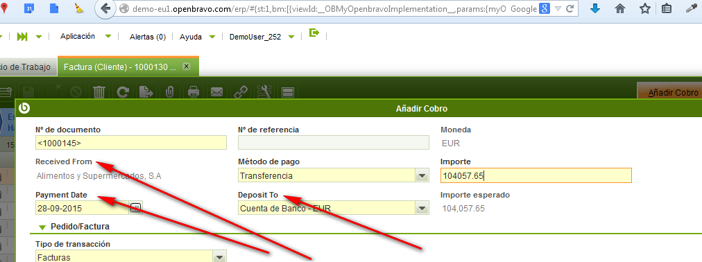 | Steps To Reproduce | 1 - Install the spanish localization pack 2 - go to Factura (Cliente) 3 - select a invoice and click on "AƱadir Cobro" 4 - observes that the window shows all fields translated to spanish, but then, some fields are shown in English (see the picture attached) | |||||||||||