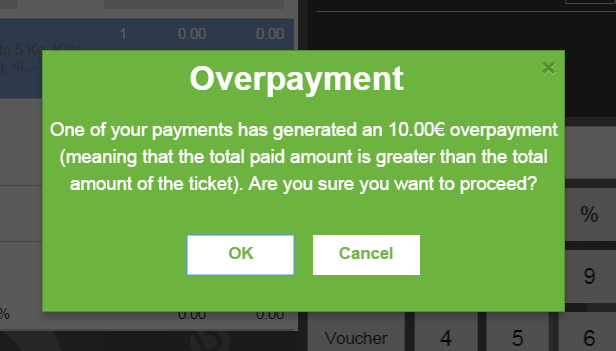| Steps To Reproduce | 1. Login as vallblanca user 2. Add an item to the ticket 3. Change item price to get 0.00 4. Click the total amount to pay it 5. Even not payment is required, add a card payment of 10.00€ 6. A message is shown (see attach): One of your payments has generated a 10.00€ overpayment (meaning that the total paid amount is greater than the total amount of the ticket). Are you sure you want to proceed?" | |||||||||||
