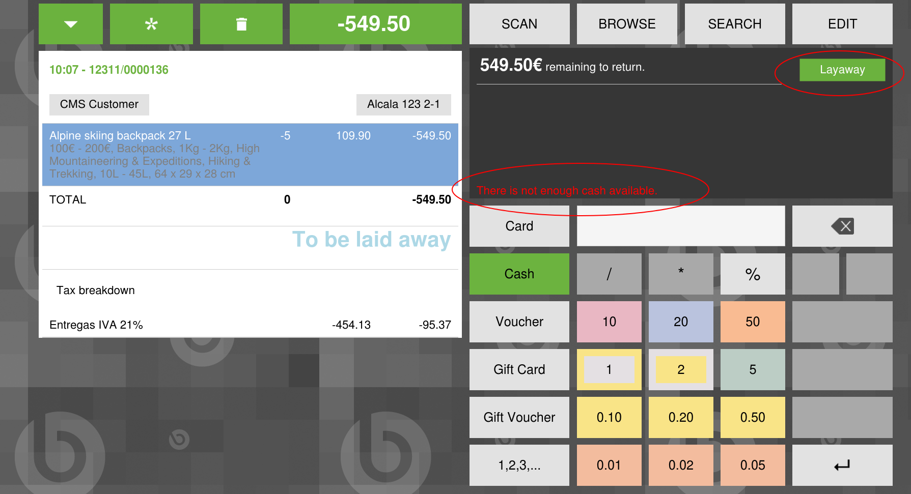 | Description | It is not possible to execute successfully a receipt marked as "To be laid away" if it has return lines in that receipt (which is correct). But a message warning that there is not enough cash to return that receipt is shown to the user although it is not possible to execute that layaway. The message says the following: "There is not enough cash available". | |||||||||||