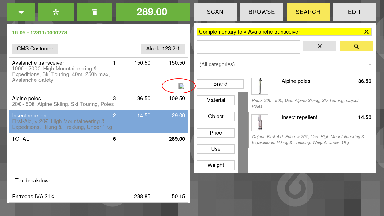 | Steps To Reproduce | 0-It is required that "Complementary Products" module is installed. 1-GO POS Backend using Openbravo client and "The White Valley Group Admin" role. Go to "Product" window and select "Avalanche transceiver" product. Then go to "Complementary Products" tab and create a new record there: In "Complementary Product*" field, enter "Alpine poles". Save this record. 2-Clean cache from POS browser. 3-Login POS online as vallblanca. 4-Once you are logged in, go offline. 5-Add 1x "Avalanche transceiver". DEFECT: In product line it is shown a "missing image" icon. | |||||||||||