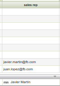 | Proposed Solution | The problem is on the AdvancedQueryBuilder.addSelectFunctionPart(). The getPropertyForTableReference() is replacing the email value with the displayed value of the related table reference. This is not correct. There are two possible solutions: a) Do not call that method for the cases where is not needed (for example when localField does not contain the $_identifier value) b) Send directly from the client side the display field of the table reference in the getSummarySettings() function (Similar to the fix for related issue https://issues.openbravo.com/view.php?id=30800 [^]) | ||||||||||